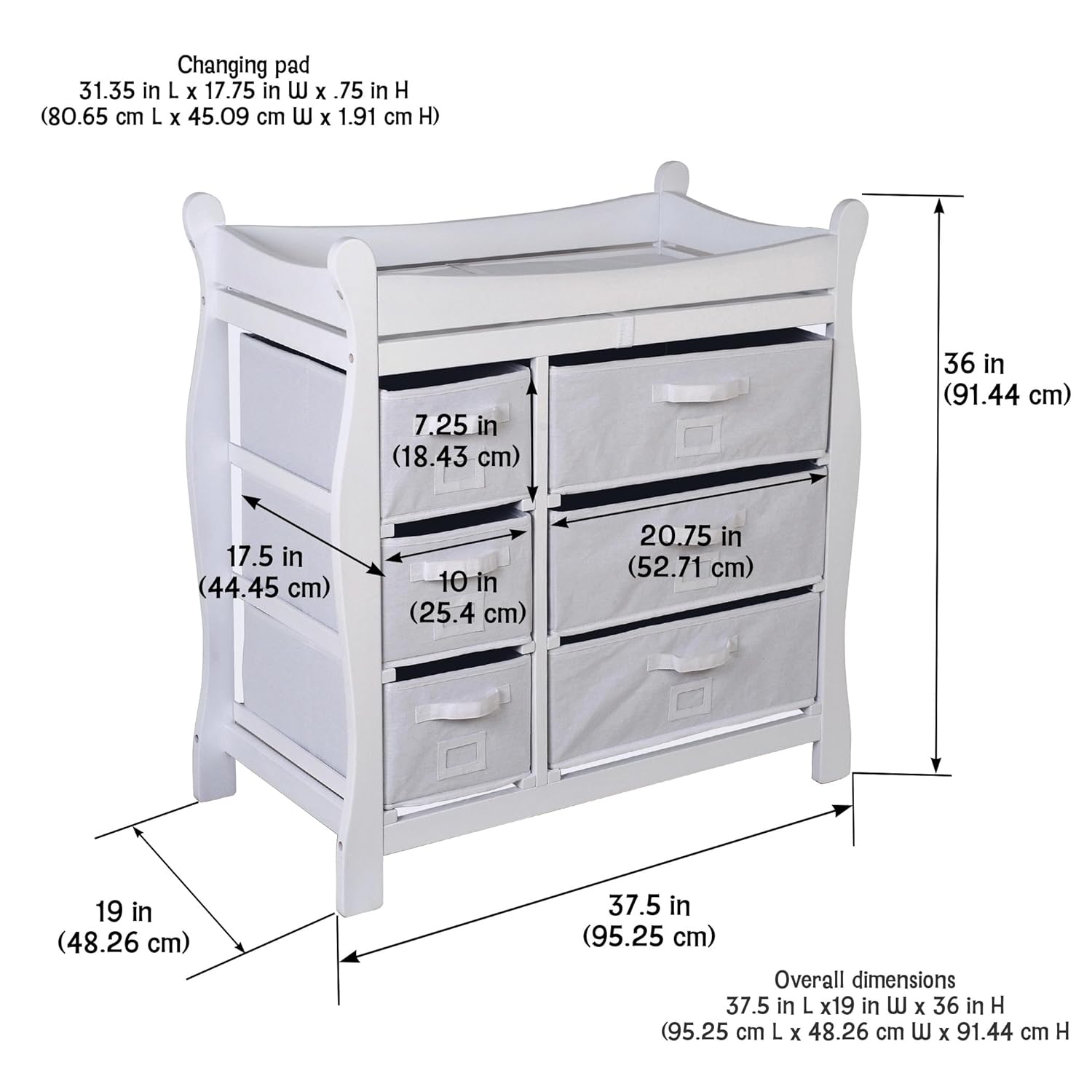 Badger Basket Sleigh Baby Changing Table with 6 Storage Drawers, Cushioned Changing Pad, Nursery Organizer, Sturdy White Wood Furniture for Infant Care