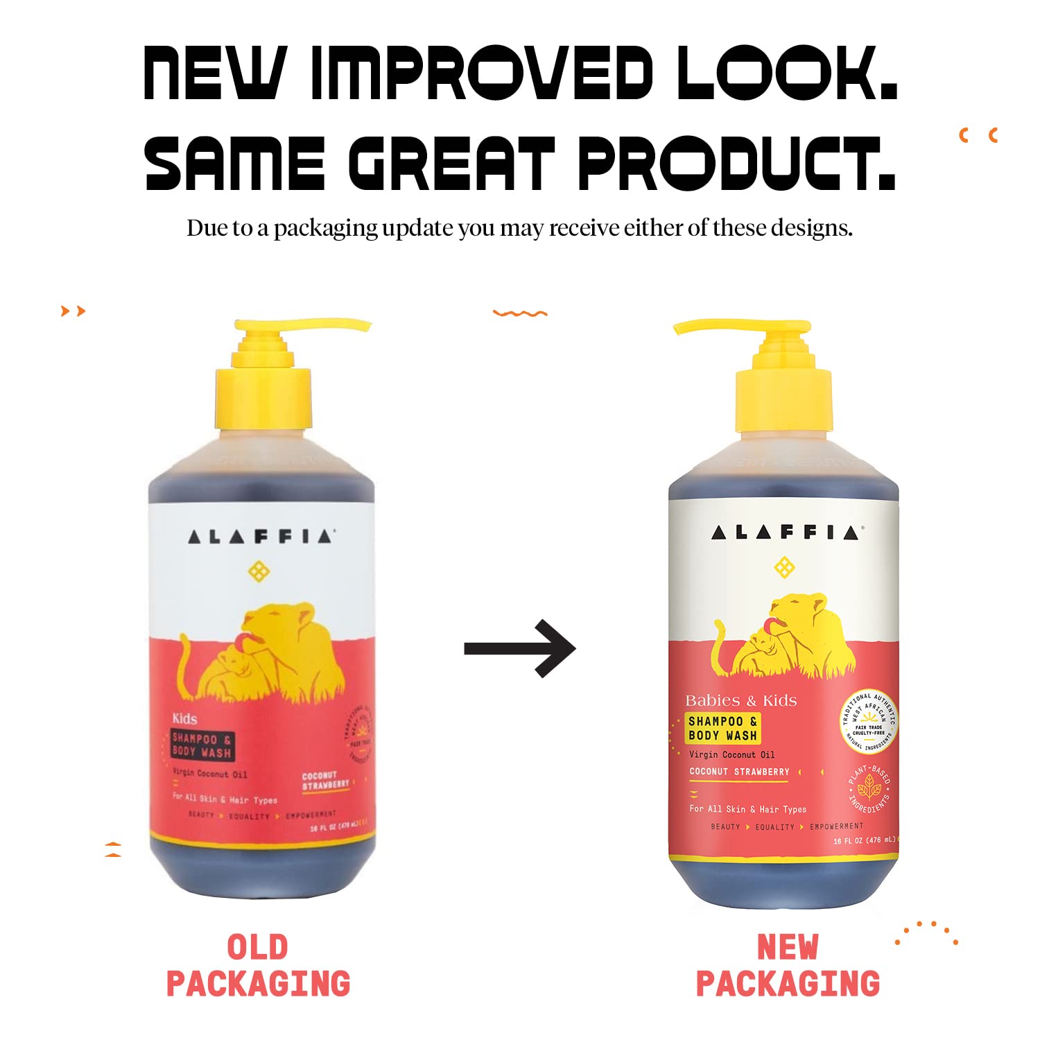 - KIDS SHAMPOO & BODY WASH. Alaffia’s playful coconut strawberry shampoo & body wash, prepared with Ethically Traded virgin coconut oil, strawberry and hibiscus, nourishes and softens hair and skin. Gentle and non-irritating for EveryDay clean fun.