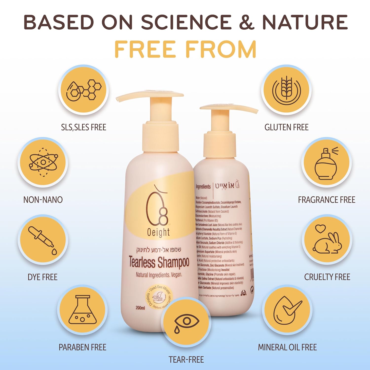 - Natural Ingredients: Oeight Tearless Shampoo for babies is crafted with 100% natural active ingredients, with Aloe Vera, Chamomile Extract, Olive Oil, Vitamin E & Provitamin B5. Formulated for sensitive scalp & newborns