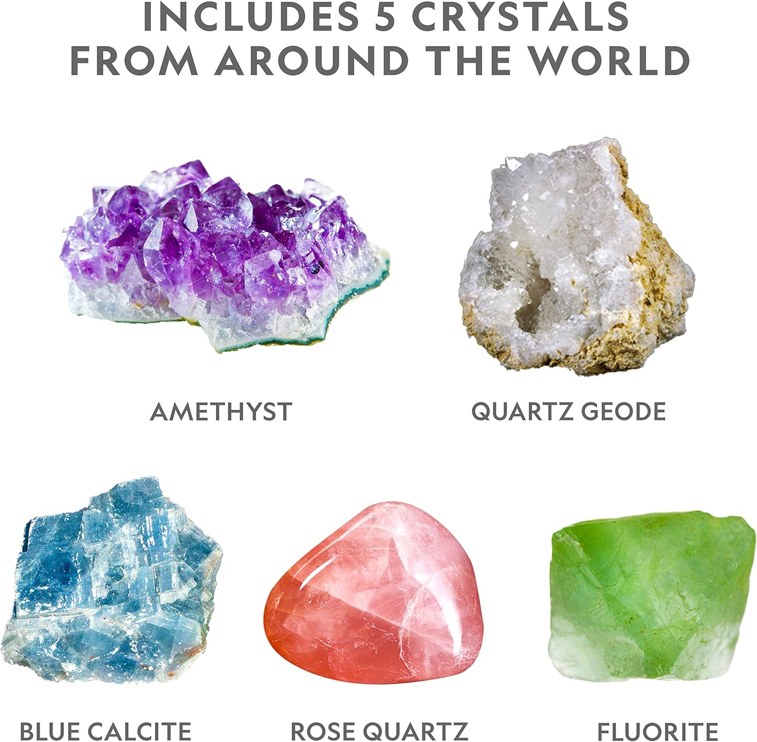 - INCLUDES REAL CRYSTAL SPECIMENS – Start or expand your rock collection! Comes with 5 real gemstone specimens: quartz, rose quartz, fluorite, calcite, and amethyst. Learn about the gemstones in the kit with the included, full-color Learning Guide.