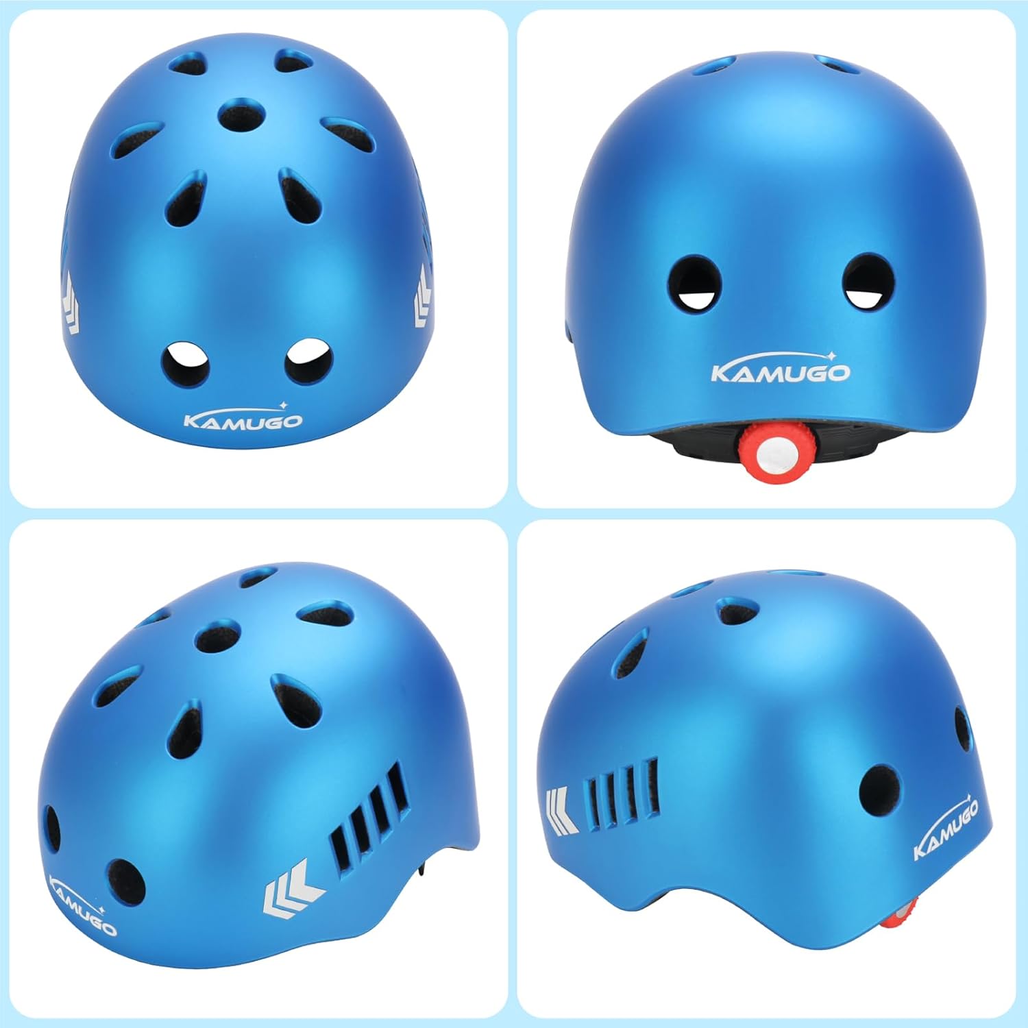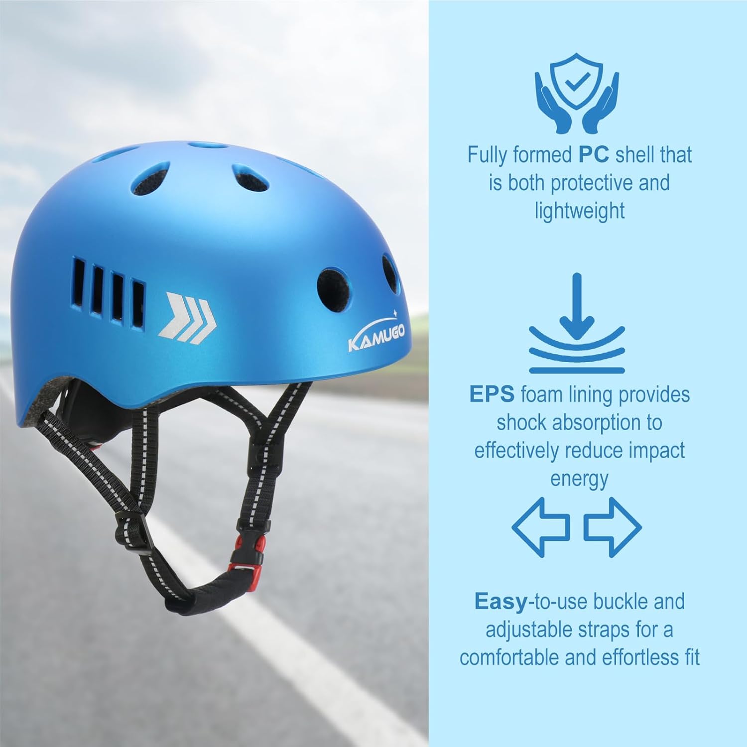 - PREMIUM SAFETY: KAMUGO kids helmets set are specially designed for kids head protection, complies with US CPSC Safety Standards,Child helmets are made with tough and durable Polycarbonate shell and high quality Expanded Polystyrene foam integrated molding,Toddler helmet have reflective markings on both sides and back, making exercise safer for children.