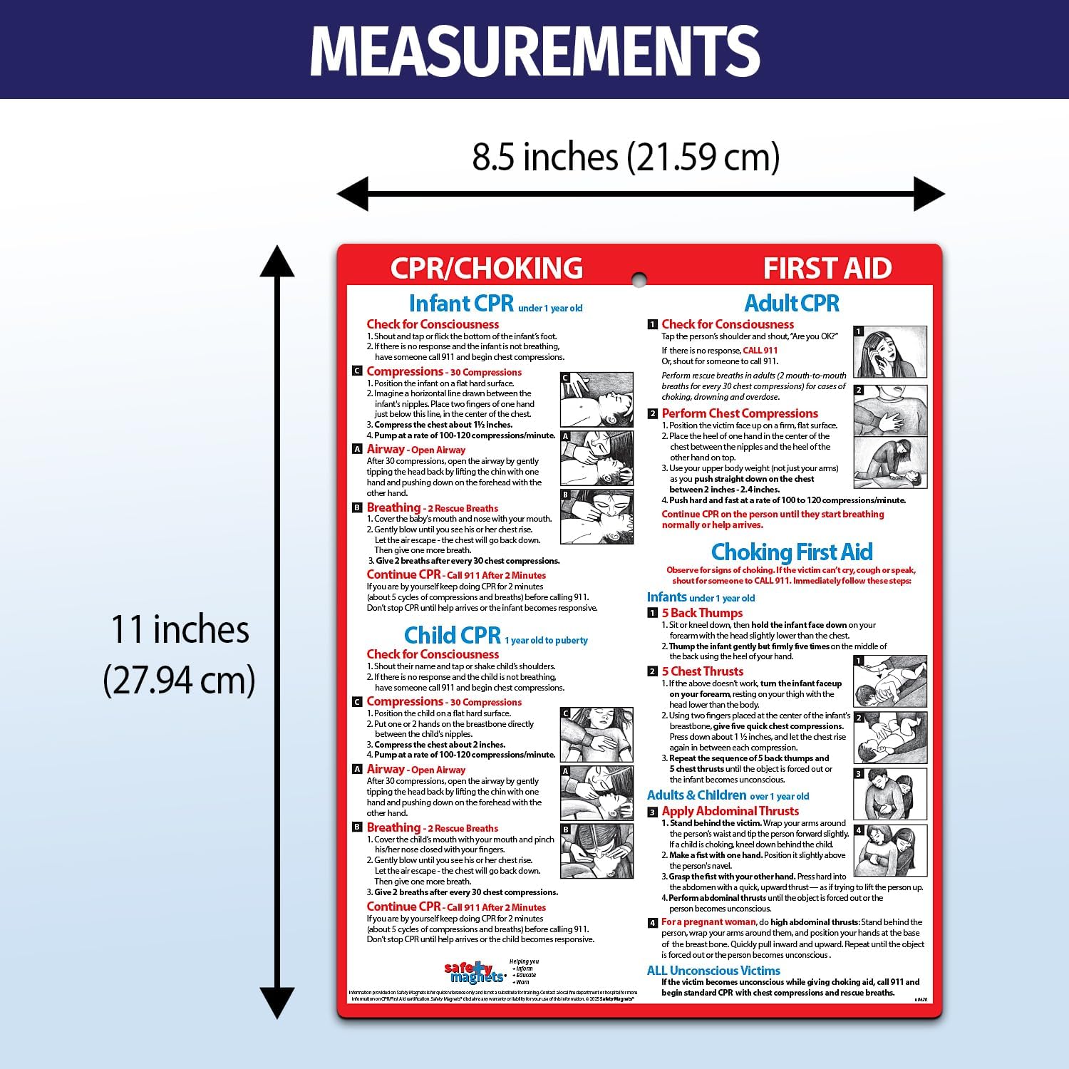 - 1 Magnetic CPR & Choking First Aid Card – Fully laminated card measures 8.5" x 11" and features 4 magnets on the back, allowing you to easily attach it to any metal surface. Made in the USA.