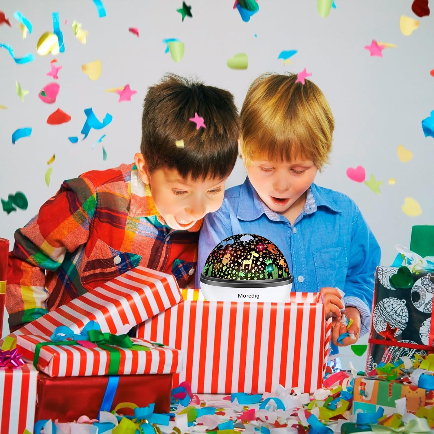 - Bring 2 Magical Worlds into Bedroom - The projector night light for kids featuring 18 projection effects. After removing the stacked shades, you can create 2 different themes - a cosmic world with adorable stars and spaceships, or an animal world with cute jungle creatures. Rotation function adds an extra element of excitement, capturing kid's attention and helping to conquer any fear of the dark