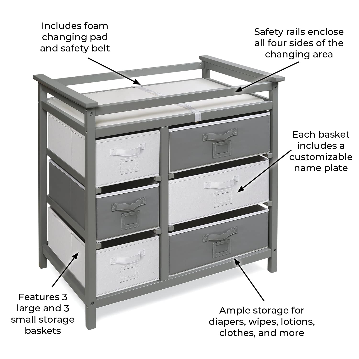 - CUSTOMIZE CHANGING TABLE DRAWER COLORS: Reversible baskets in gray and white allow you to customize our furniture to match the look of your nursery or bedroom, while nameplate pockets help you easily label and organize contents.