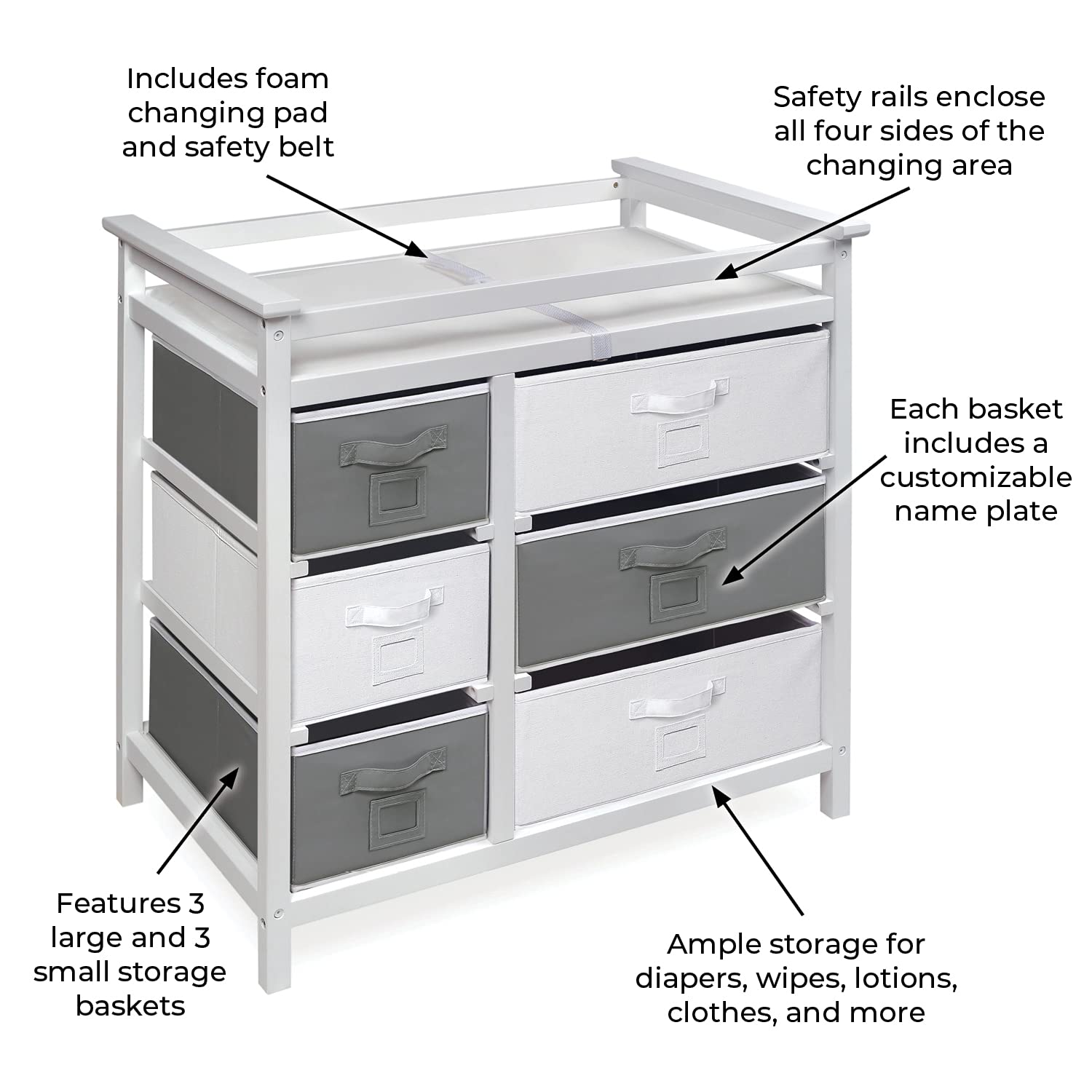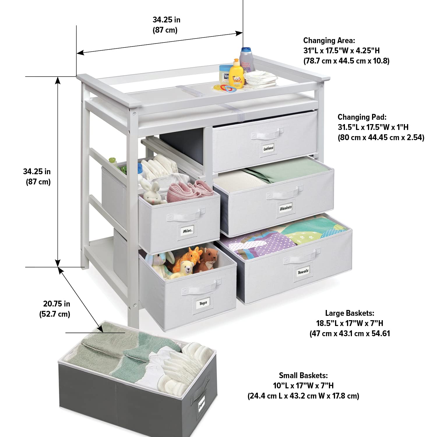 - ORGANIZED CHANGING STATION: The Modern Baby Changing Table features three large and three small baskets, perfect for neatly storing diapers, wipes, creams, and more, making diaper changes a breeze.
