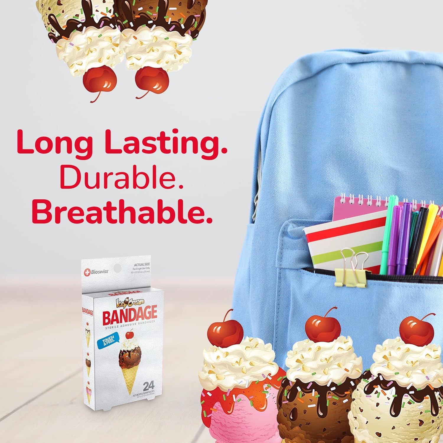 BioSwiss Bandages, Ice Cream Shaped Self Adhesive Bandage, Latex Free Sterile Wound Care, Fun First Aid Kit Supplies for Kids, 24 Count