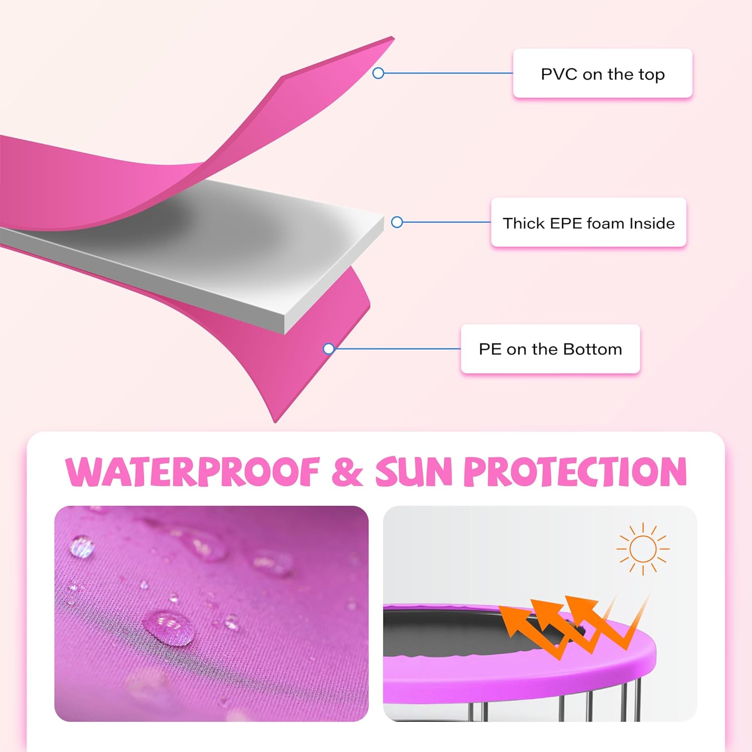 - Specification: Trampoline pad width: 8/10FT: 9.45 inch (24cm), 12FT: 8.66 inch (22cm), 14/15FT: 10.63inch (27cm). Anti-UV/Waterproof/Faded Resistance PE cover,thick EPE foam(16mm), PE bottom, ultra durable for years to use!