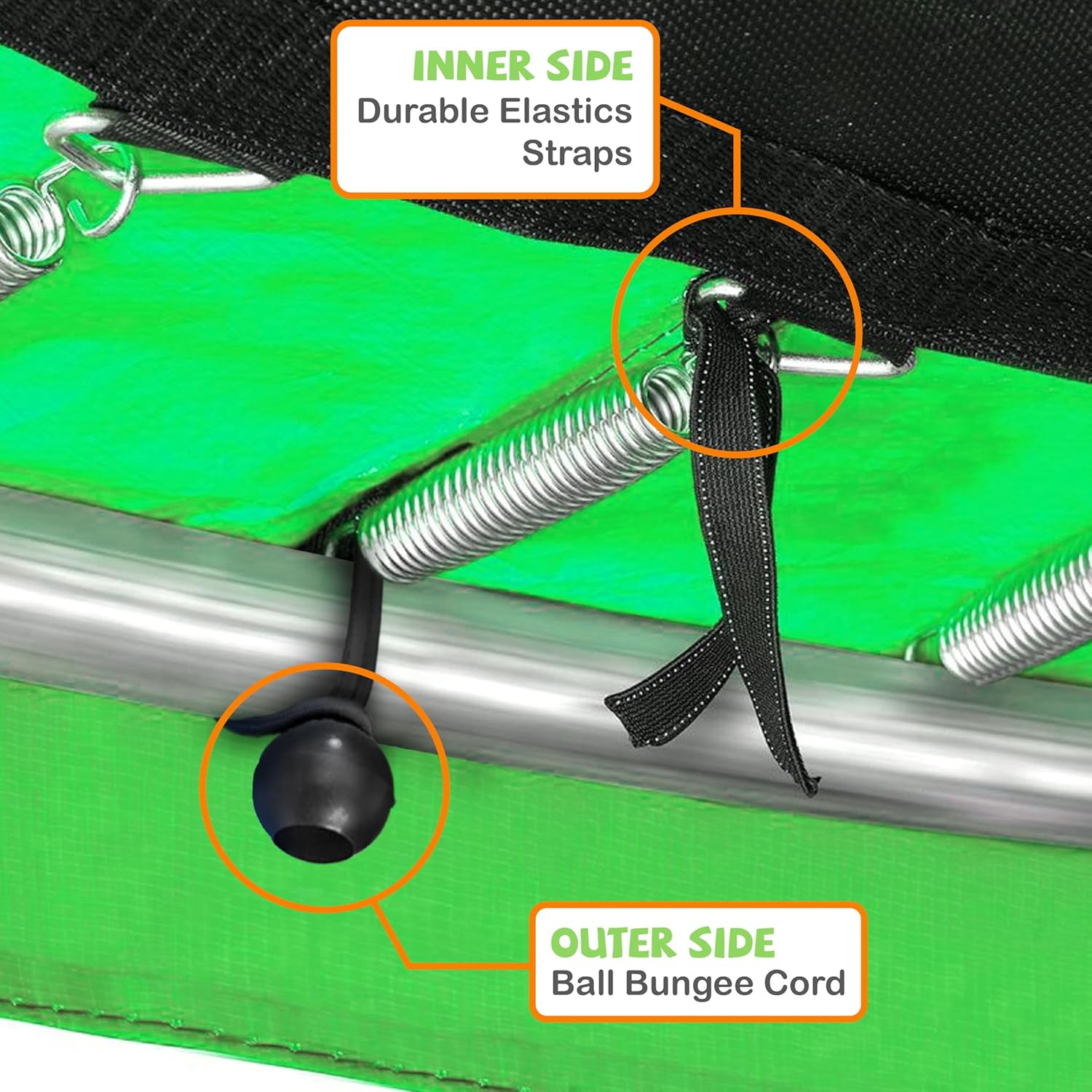 - Specification: Trampoline pad width: 8/10FT: 9.45 inch (24cm), 12FT: 8.66 inch (22cm), 14/15FT: 10.63inch (27cm). Anti-UV/Waterproof/Faded Resistance PE cover,thick EPE foam(16mm), PE bottom, ultra durable for years to use!