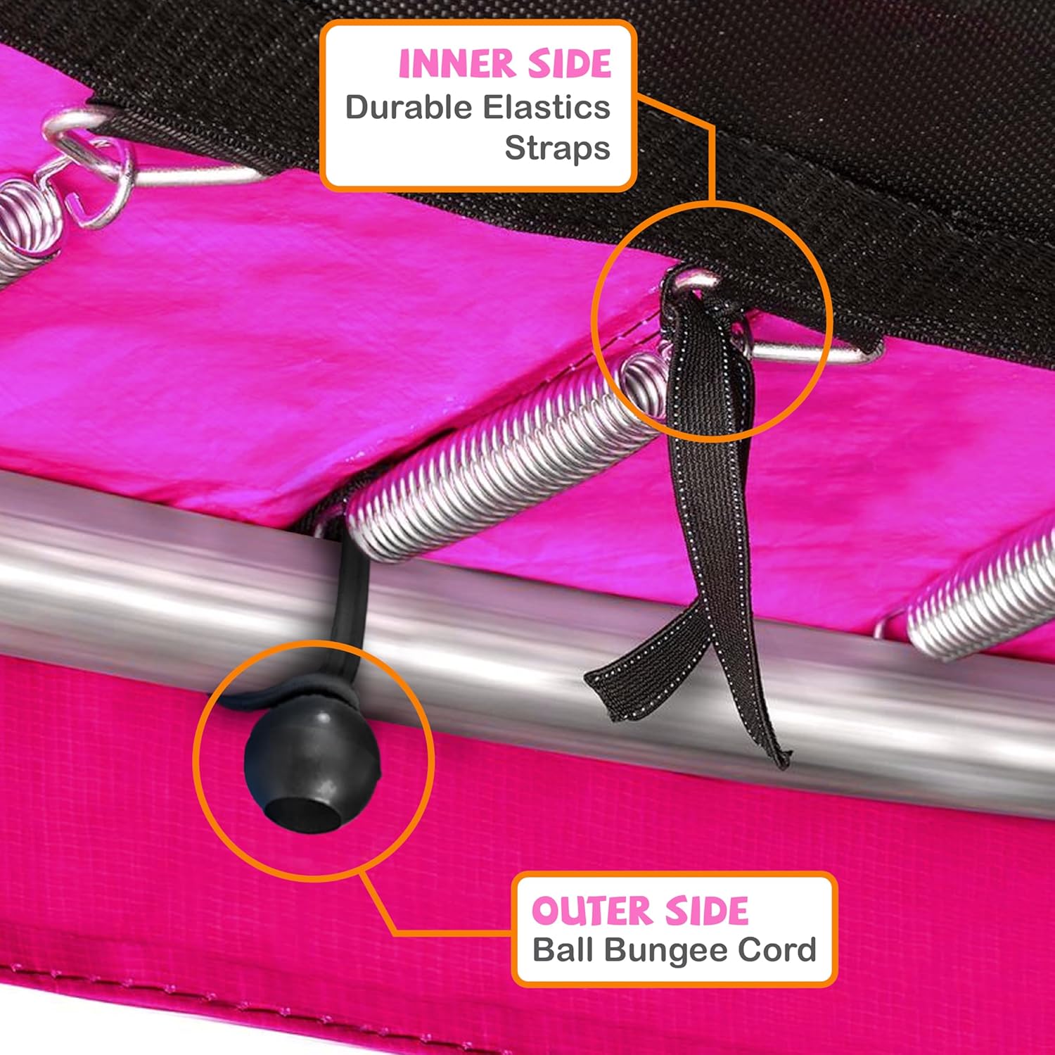 - Specification: Trampoline pad width: 8/10FT: 9.45 inch (24cm), 12FT: 8.66 inch (22cm), 14/15FT: 10.63inch (27cm). Anti-UV/Waterproof/Faded Resistance PVC cover,thick EPE foam(16mm), PE bottom, ultra durable for years to use!