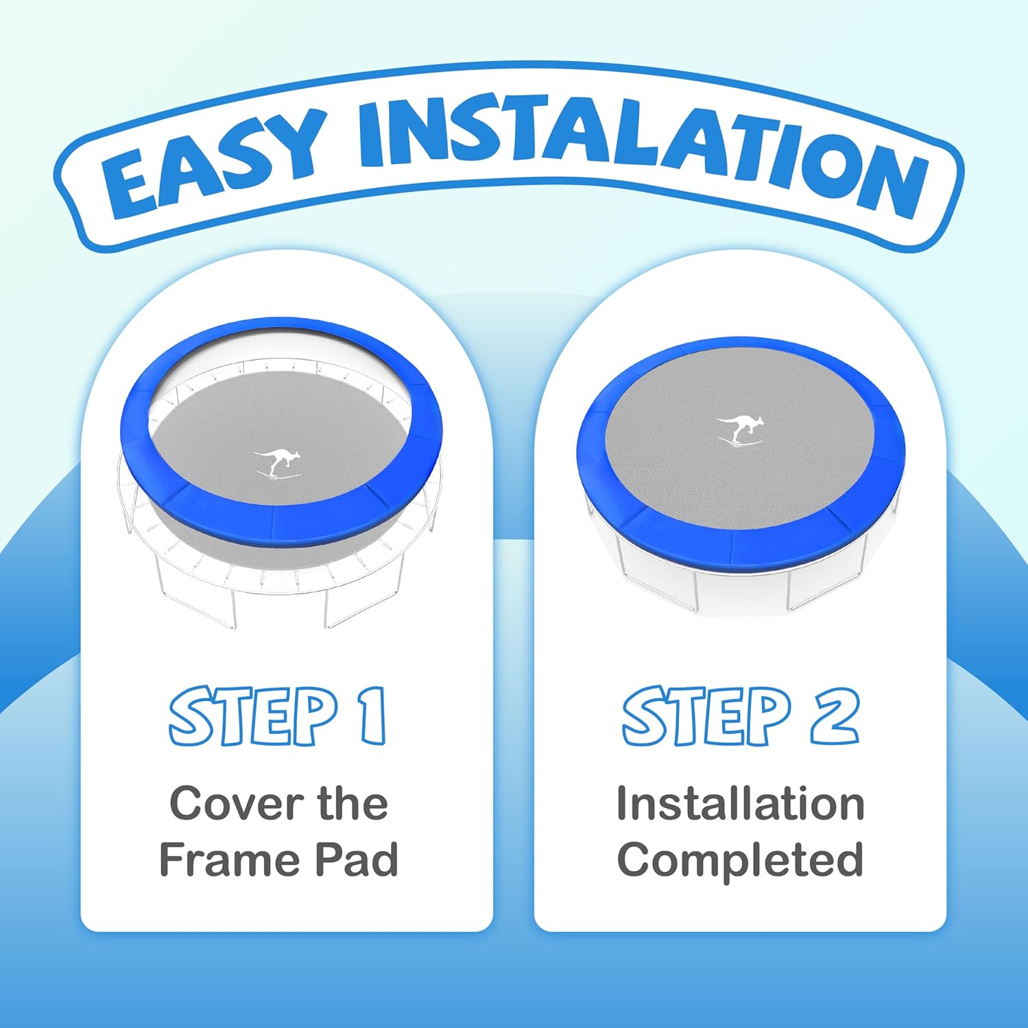 - Specification: Trampoline pad width: 8/10FT: 9.45 inch (24cm), 12FT: 8.66 inch (22cm), 14/15FT: 10.63inch (27cm). Anti-UV/Waterproof/Faded Resistance PVC cover,thick EPE foam(16mm), PE bottom, ultra durable for years to use!