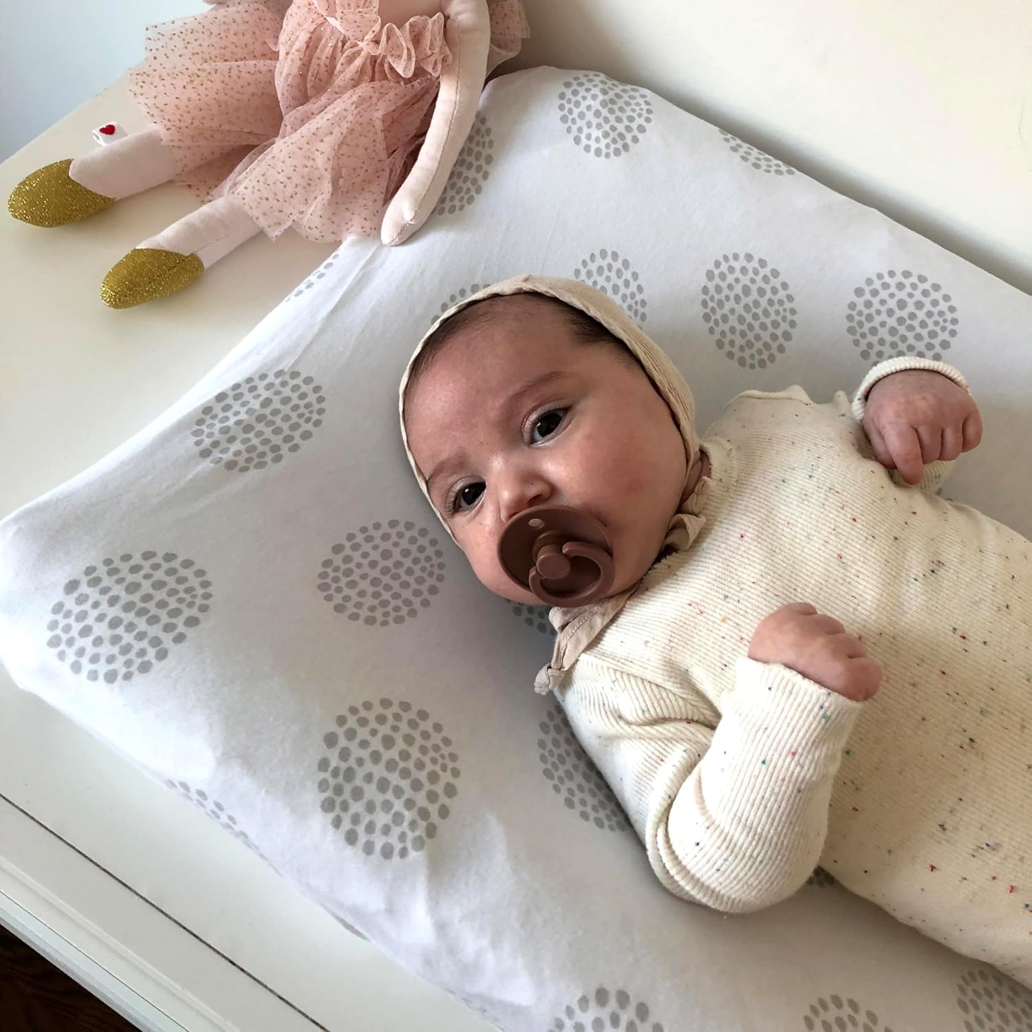 - This convenient two-pack features a modern and playful grey polka dot design paired with a grey dotted circle set on white, combed jersey knit cotton. You can be rest assured that your baby’s sleep surface will always be covered with a clean, trendy, and soft cotton sheet with this changing pad covers│cradle sheet set!