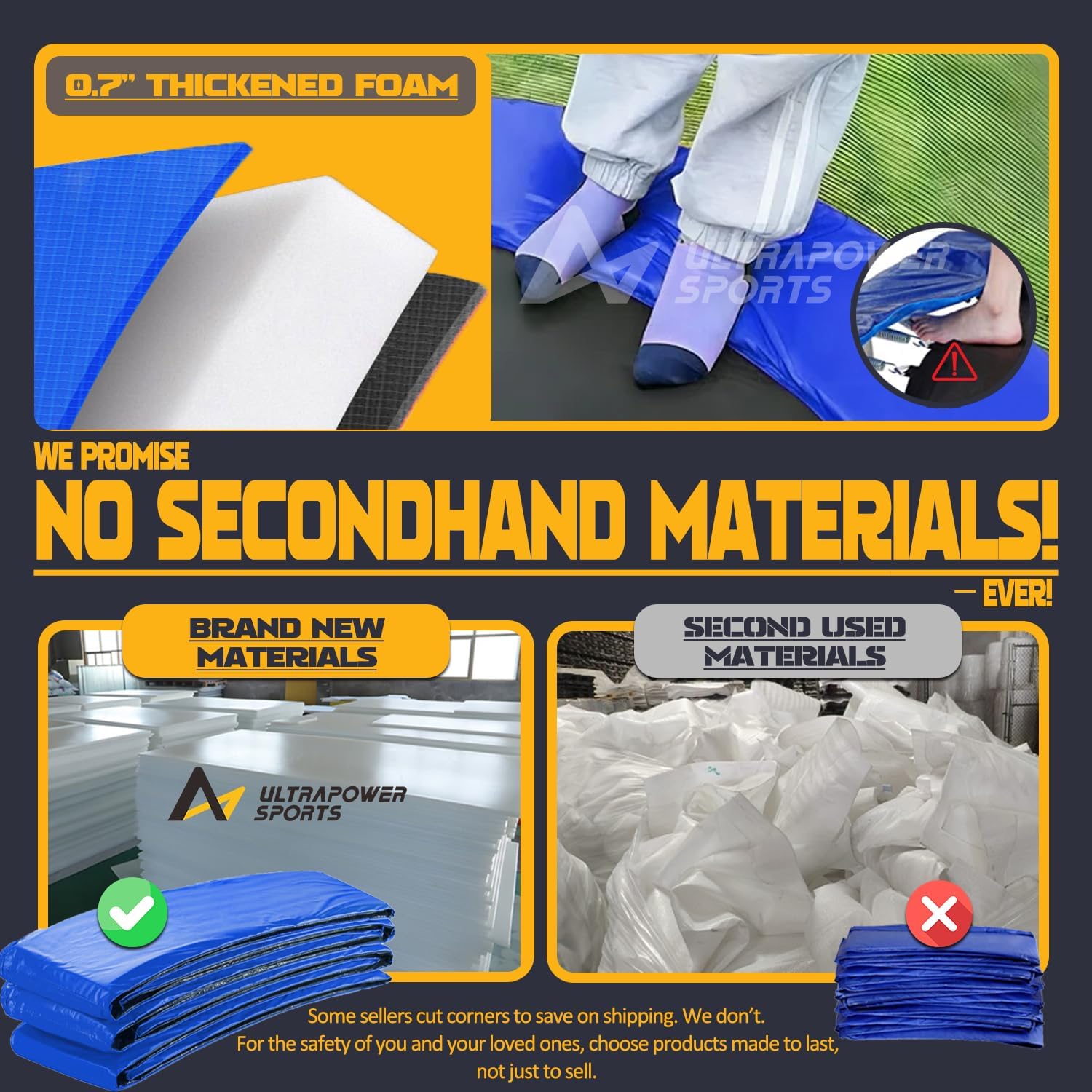 - 🏆️【Trusted Quality ULTRAPOWER SPORTS trampoline pad】 As a top-tier trampoline replacement mat brand, we prioritize safety and durability. We believe that you who appreciate quality will know how to choose wisely. The double industrial-grade stitching and triple-layer construction (PVC + PE + padding) outperform other flimsy covers. Whether replacing worn-out mats or upgrading old trampolines, choose our trampoline pad replacement that balances affordability with professional-grade performance.