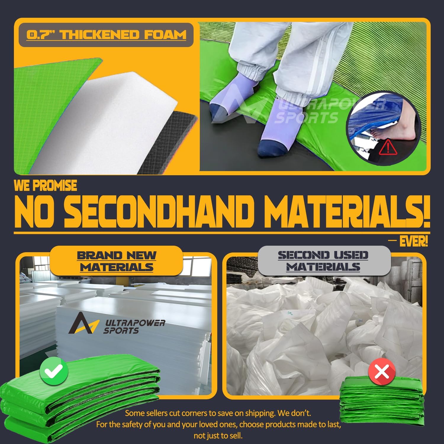 - 👨👩👧👧【270° All-Around Safety Protection】👨👩👧👧At ULTRAPOWER SPORTS, your child's safety comes first! Our trampoline pad replacement is designed to shield kids from exposed springs, preventing injuries while they jump. The extended 270° protective cover wraps around the trampoline frame, offering inside-out protection. Built for durability, it features a 0.55mm thick PVC surface + 0.6-inch protective cotton + an ultra-dense PE bottom, ensuring maximum safety, comfort and fun.