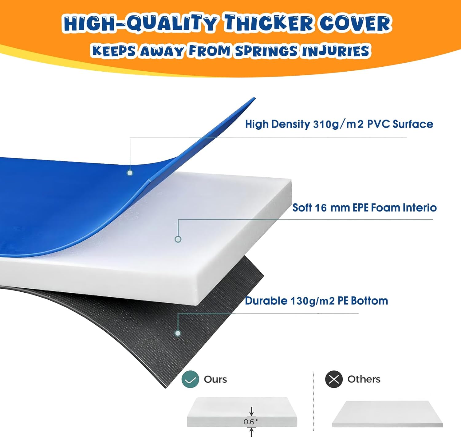 - 👨👩👧👧【270° All-Around Safety Protection】👨👩👧👧At ULTRAPOWER SPORTS, your child's safety comes first! Our trampoline pad replacement is designed to shield kids from exposed springs, preventing injuries while they jump. The extended 270° protective cover wraps around the trampoline frame, offering inside-out protection. Built for durability, it features a 0.55mm thick PVC surface + 0.6-inch protective cotton + an ultra-dense PE bottom, ensuring maximum safety, comfort and fun.