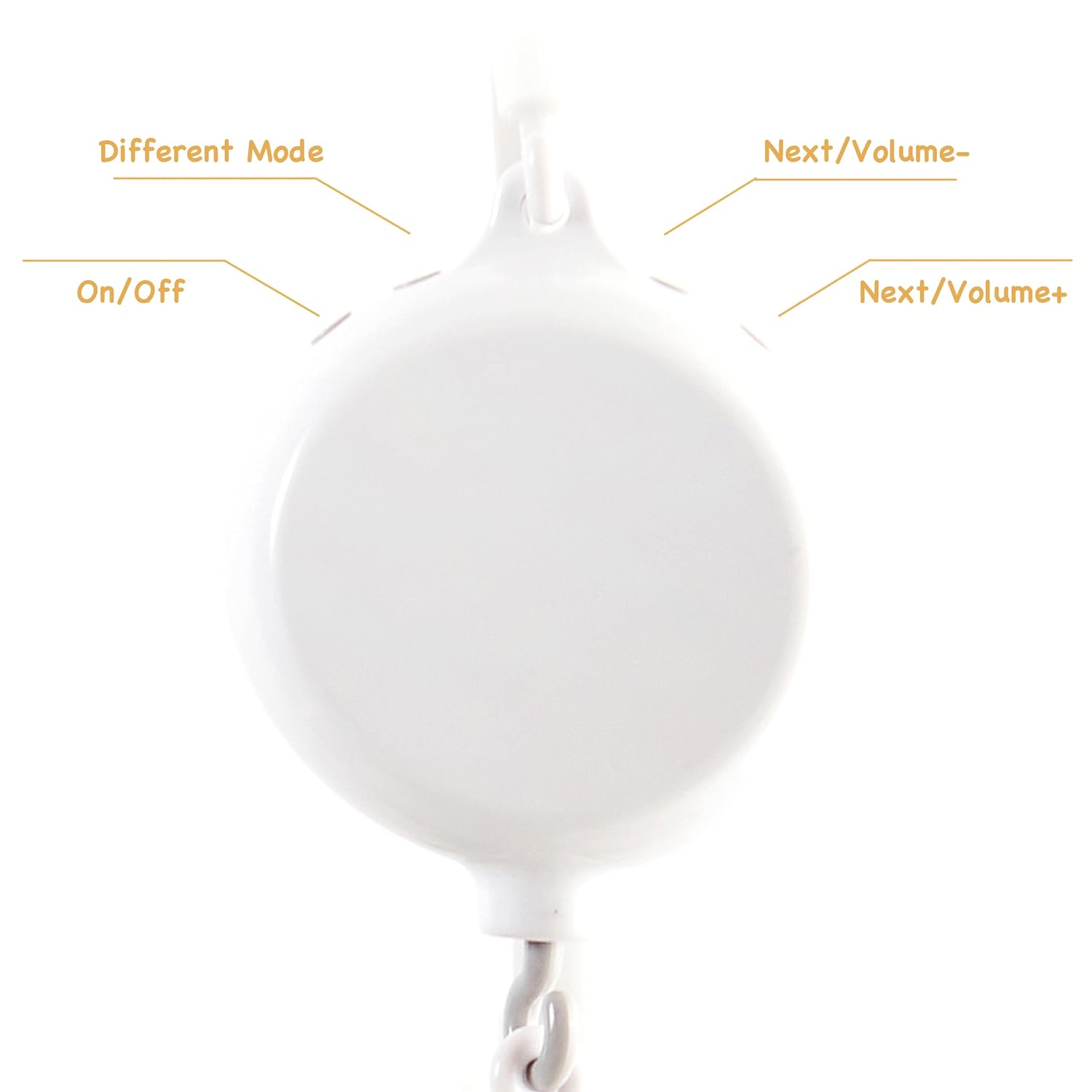 - Updated to three modes including rotation only, music only, rotation and music that plays twelve different lullabies with on/off switch and volume control. After 25min of usage, it will shut off automatically to preserve battery.