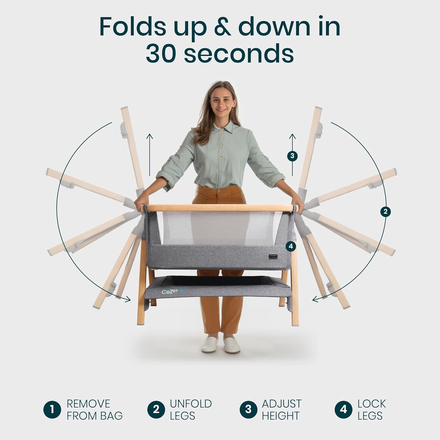 - SET UP IN 30 SECONDS - Thanks to our innovative fast-folding mechanism, the baby bedside bassinet is ultra-quick to set up! The wood-effect legs lock securely into place to keep the bedside crib stable.