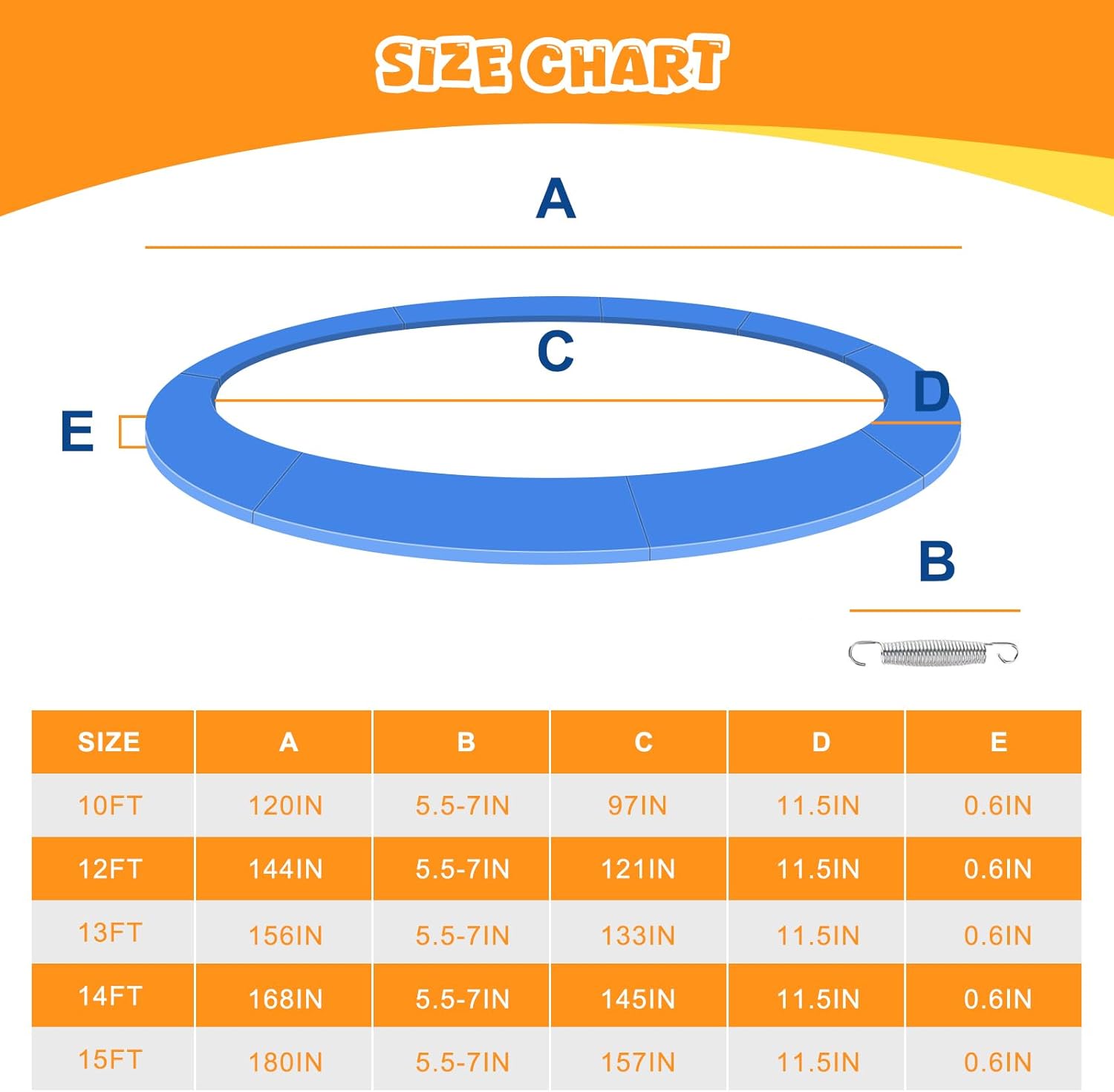 - ⭕️【Extra-Wide Safety Barrier to Prevent Spring Contact】With an 11.8-inch width and full-edge encapsulation, this replacement trampoline pad completely covers trampoline springs and frames, eliminating pinch points. The heavy-duty PVC-PE hybrid material resists tears, while the rust-proof design extends your trampoline’s lifespan. Parents, school managements you and me can trust this 10FT trampoline pad, just focus on fully enjoying the bounce and fun that the trampoline brings!