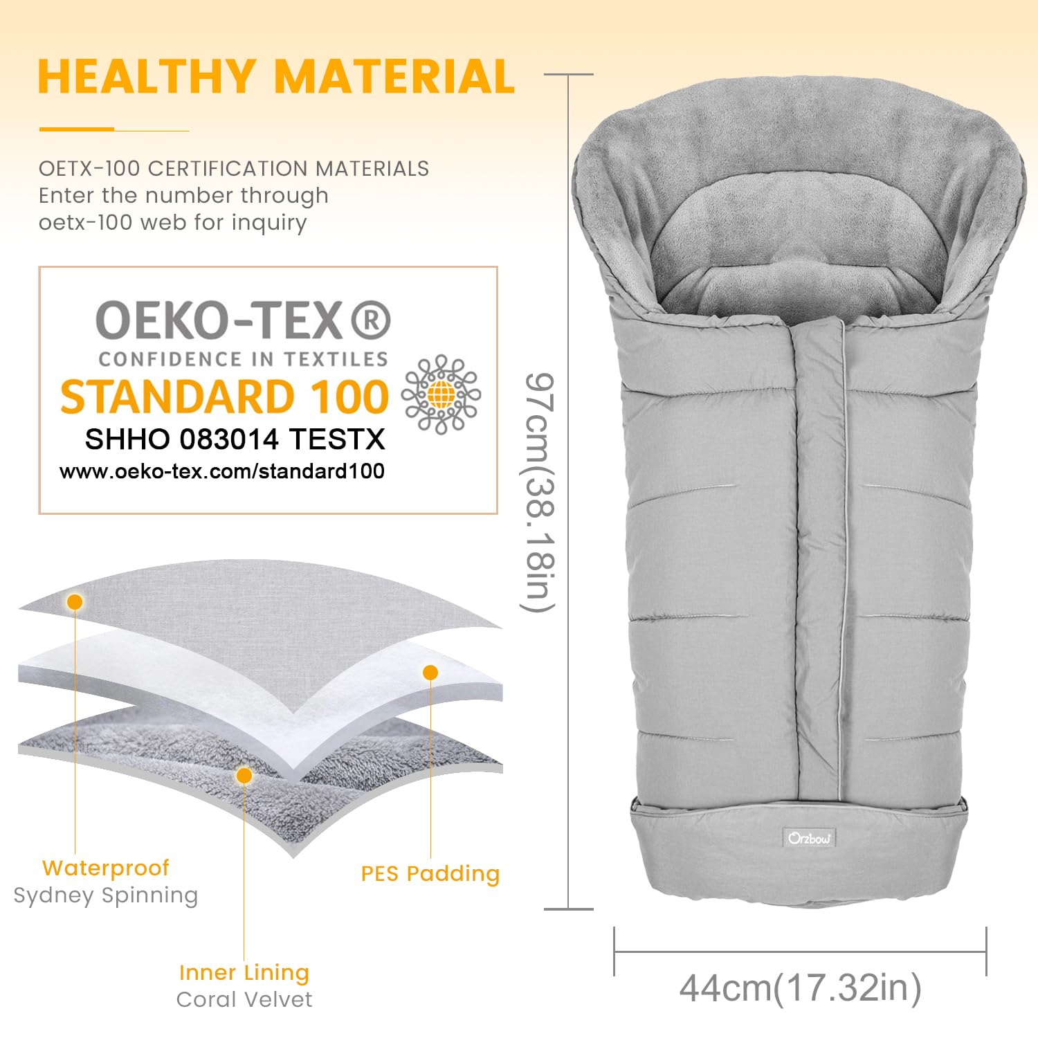 - 💪[Premium Quality & Large Size]: Made of high quality waterproof and snowproof Pongee Fabric with Cozy PES Padding and Coral Fleece Lining (OEKO-TEX Standard 100 Authentication Material ) which can help easy clean dirt off and keep extremely warm, Orzbow Warm Stroller Cover with the size of 38.18 * 17.32'' can let your little one sleep comfortably and move freely in the stroller or enjoy the outside world even on severe cold days.
