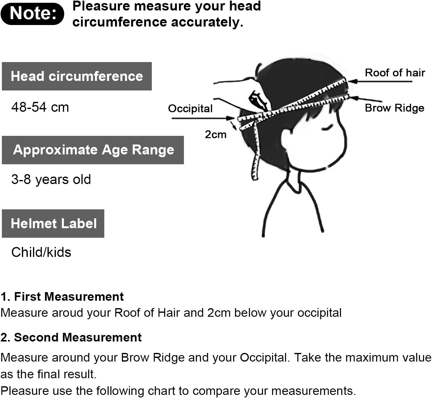 - Kids helmet: Suitable for 3-8 years old kids and toddlers with helmet size: 48-54 cm / 18.9-21.3". This kids bike helmet is easily adjustable for a snug fit, it could grow with your child for few years.