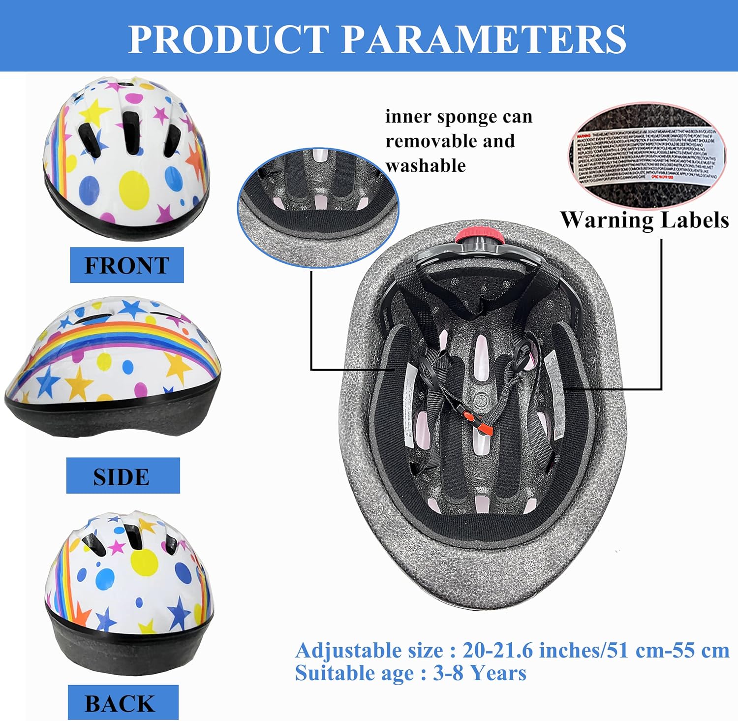 - 【Adjustable Design】: Kids skate helmet suitable for ages 3-8 years old boys and girls with helmet size 20”-21.6”/51 cm-55 cm. Toddler helmets come with an adjustable helmet turning knob and adjustable straps, can be flexibly adjusted to the size suitable for children. Helmet vents and foam keep kids cool, comfortable and reduce sweating when they during sport movement