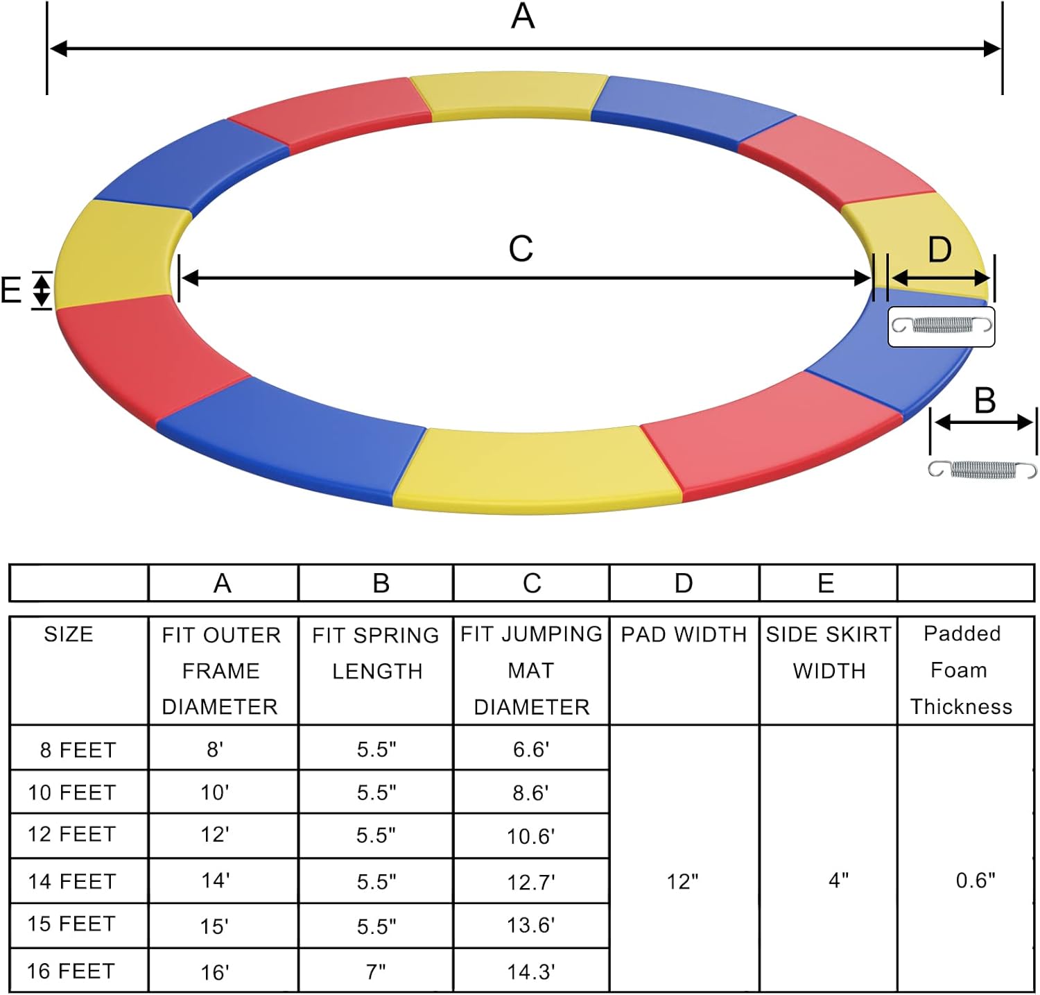 - [ Easy to Assemble & Replace ] Our 14 Ft trampoline safety pad has a folding design, which helps to reduce a lot of tedious assembly steps. All you need to do is lay it flat on the trampoline and fix the 36 elastic ropes. The simple replacement process will not waste your too much time and energy.
