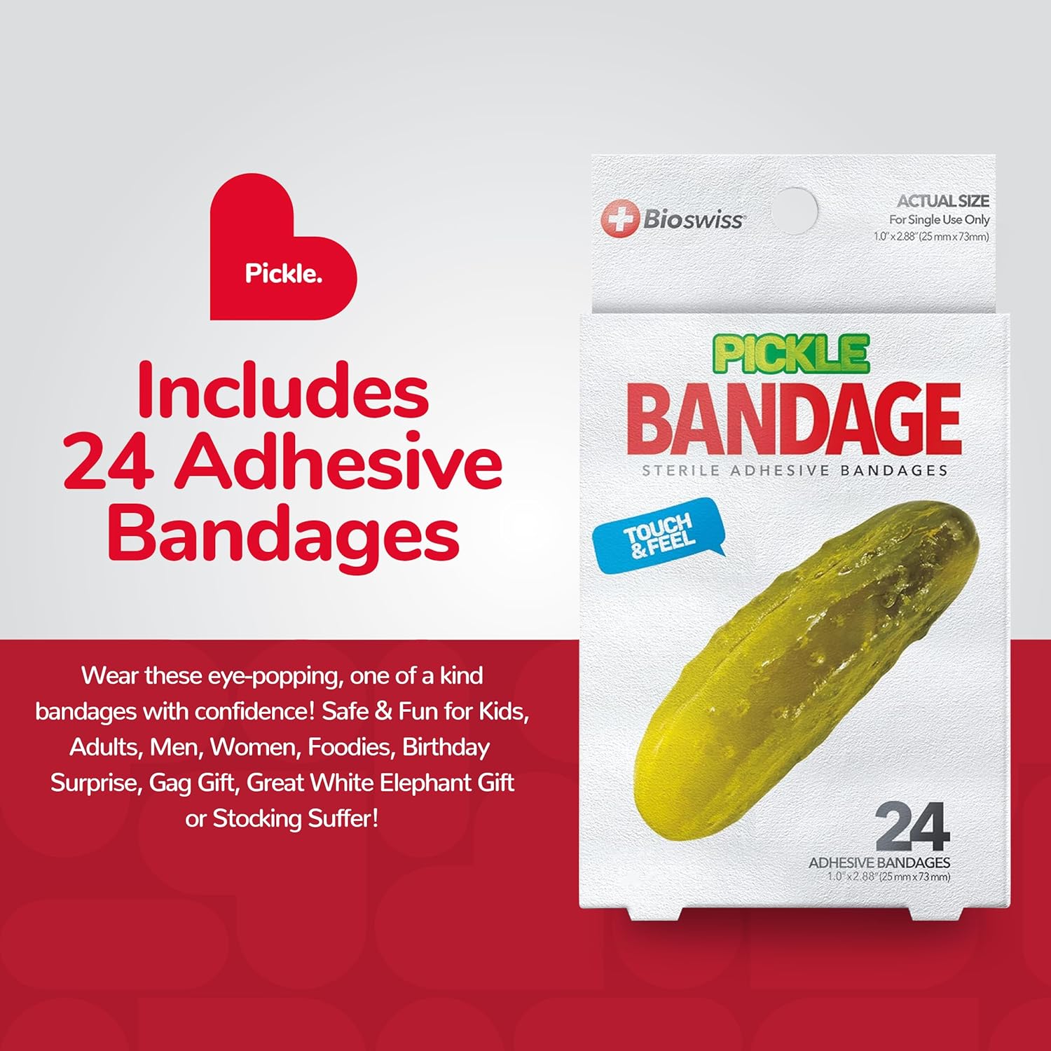 - PICKLE BANDAGES: This 24 piece pack of adorable and delicious looking pickle bandages is great for putting a smile on kids' faces while protecting wounds such as cuts, scrapes, and burns; sticky bandages are perfect for kids and adults alike, and also for school nurses and pediatric doctors
