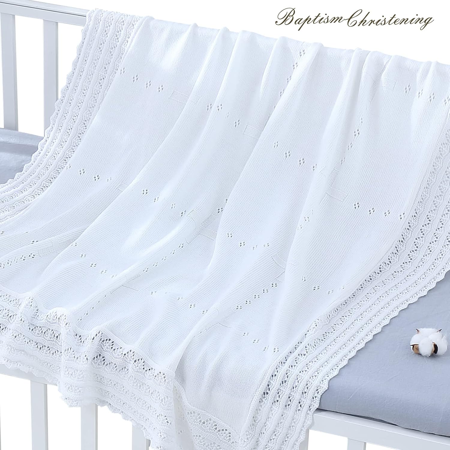 Booulfi Baby Blanket White Receiving Blanket Baptism Christening Towel for Newborn Girls Boys, White Cotton Knit Thermal Baby Blanket Shawl with Cross Pattern, 47”x47”