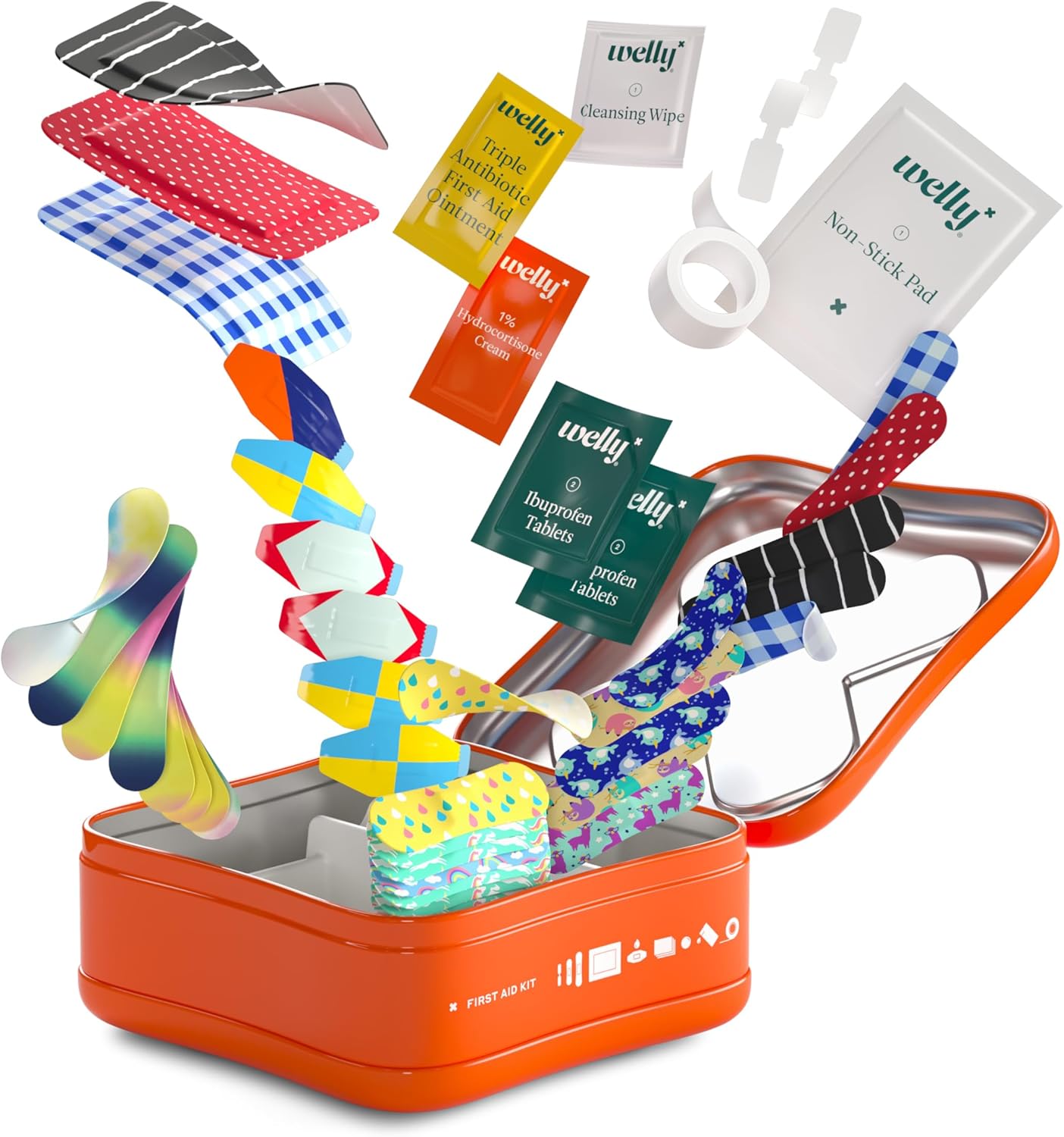 Welly First Aid Kit - Adhesive Flexible Fabric and Waterproof Bandages, Tape and Non-Stick Pads, Butterfly Strips, Single Use Ointments Triple Antibiotic and Hydrocortisone, and Ibuprofen - 130 Count
