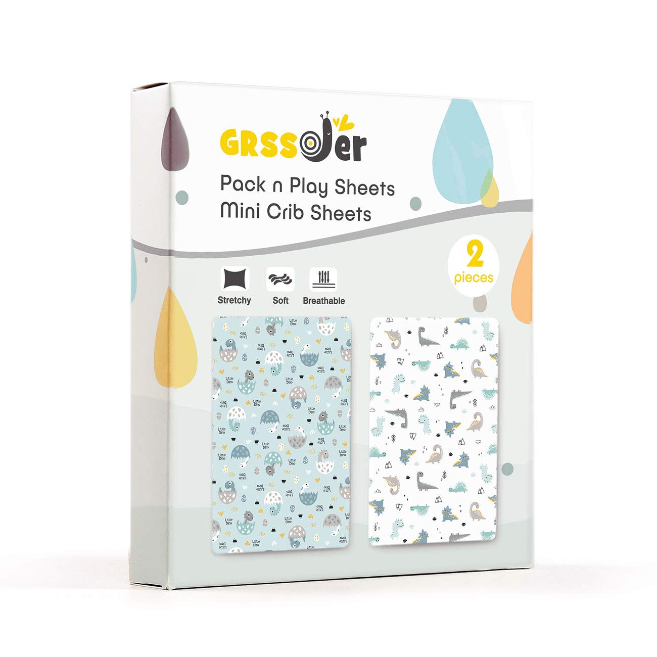 GRSSDER Stretchy Ultra Soft Jersey Knit Fitted Pack n Play Sheets Set 2 Pack, Portable/Mini Crib Sheets for Boys, Universal Fit for Pack N Plays Safe and Snug, Happy Dinosaurs for Baby