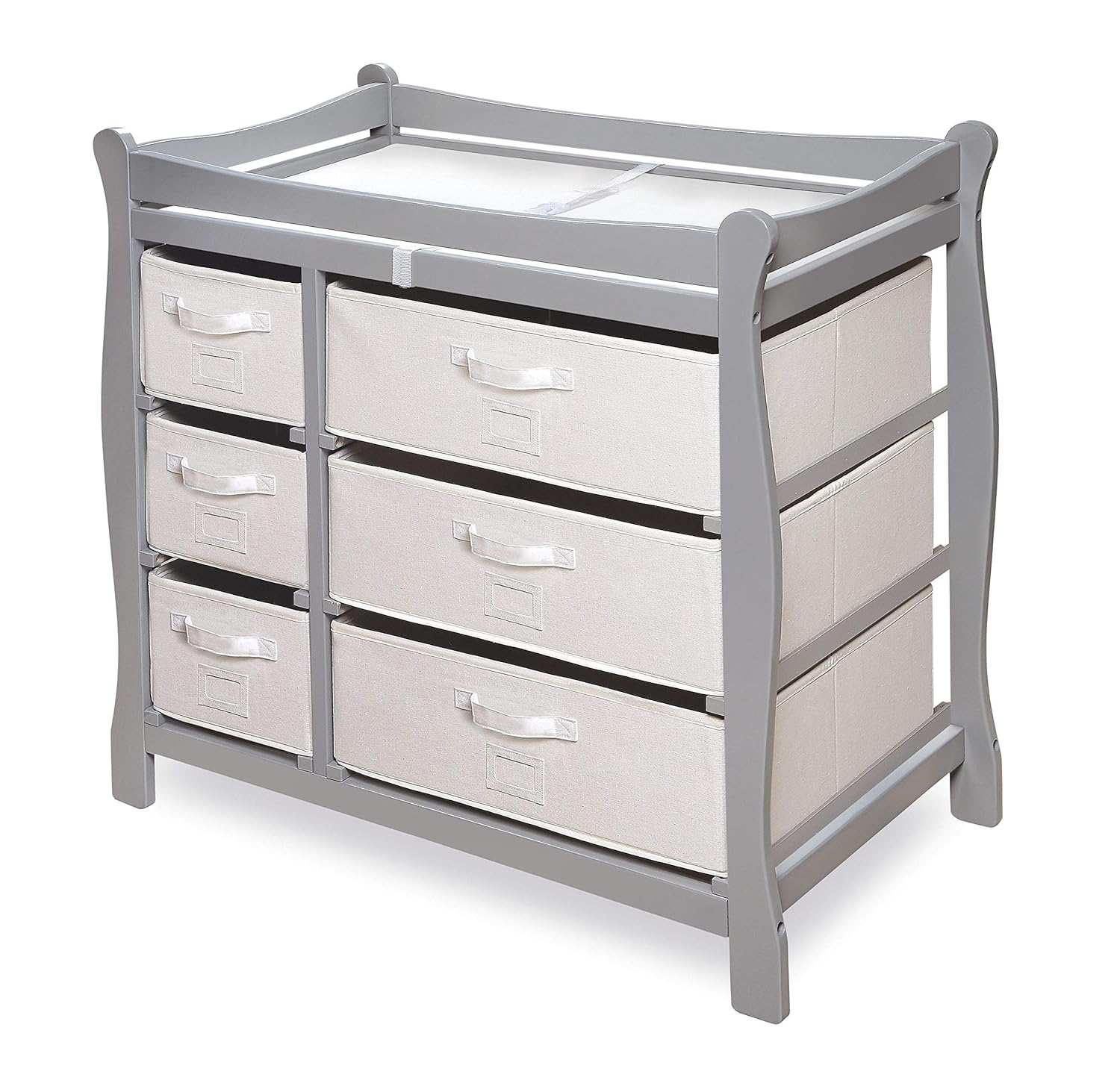 Badger Basket Sleigh Style Baby Changing Table - Diaper Station with 6 Removable Storage Baskets, Safety Rails, Pad, and Belt - Nursery Organizer - Cool Gray