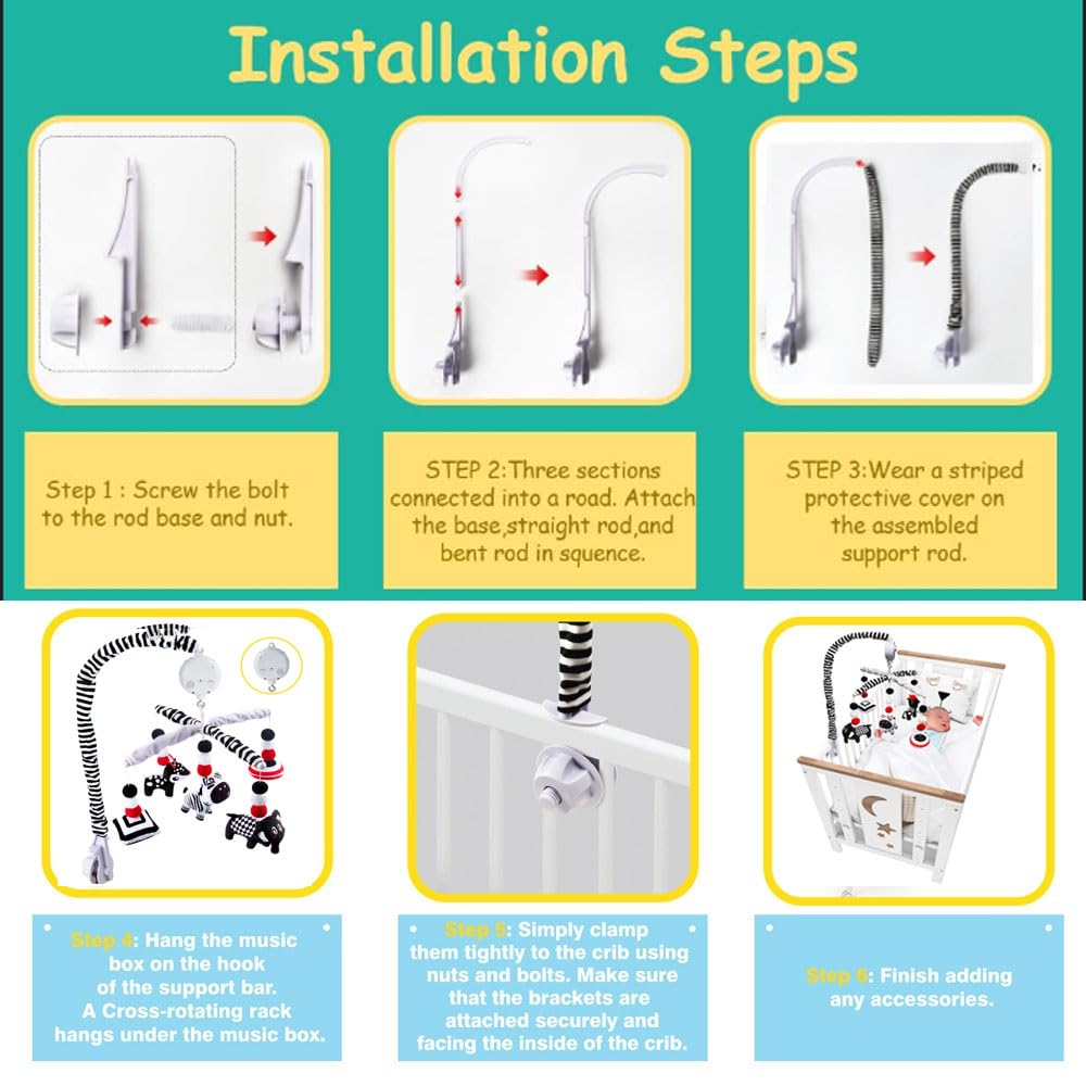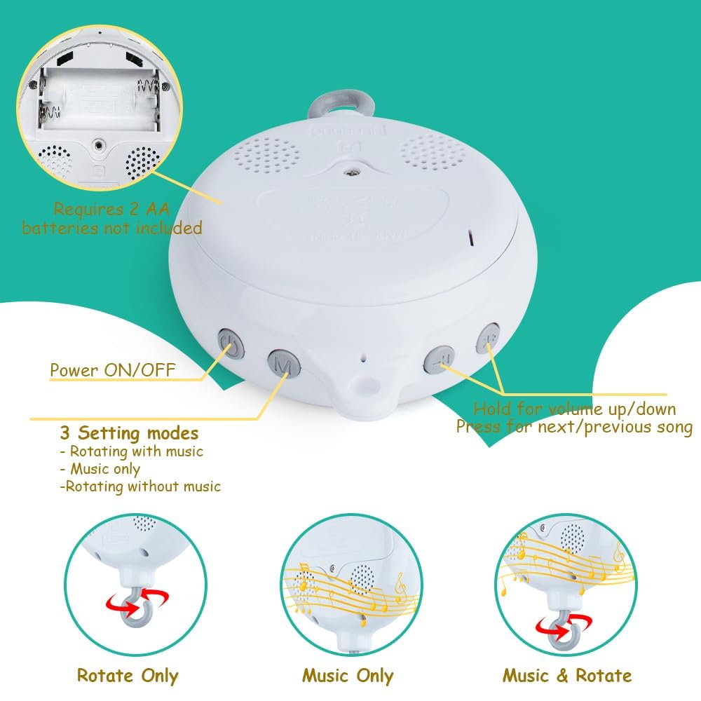 - ♫ MADE FOR BABY'S VIEW - UPGRADED MUSIC BOX, Easy to install, no screw needed,Requires 2 AA (not included). The baby mobile is made of safe ABS material, and the cute soft crib toys are handmade from high-quality stretch cotton, offer your baby harmless using experience. (Before Purchasing, please make sure the edge of your crib suitable for the baby bed holder). Crib mobiles keep your baby entertained, so you can have a little break or complete chores as your baby plays.