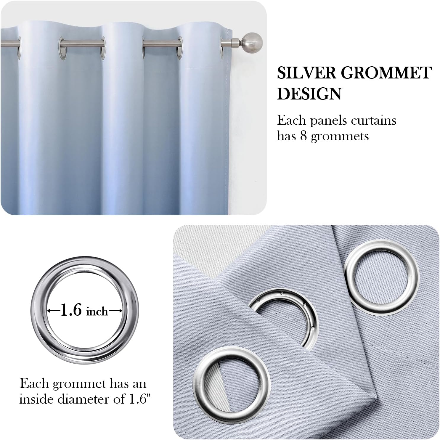 - ★PACKAGE MADE: Your package includes two gradient curtain panels. Each panel measures 52 inches in width, a total width of 104 inches. 8 silvery grommets (1.6-inch inner diameter) of each panel make the blackout curtains easy to install and slide.