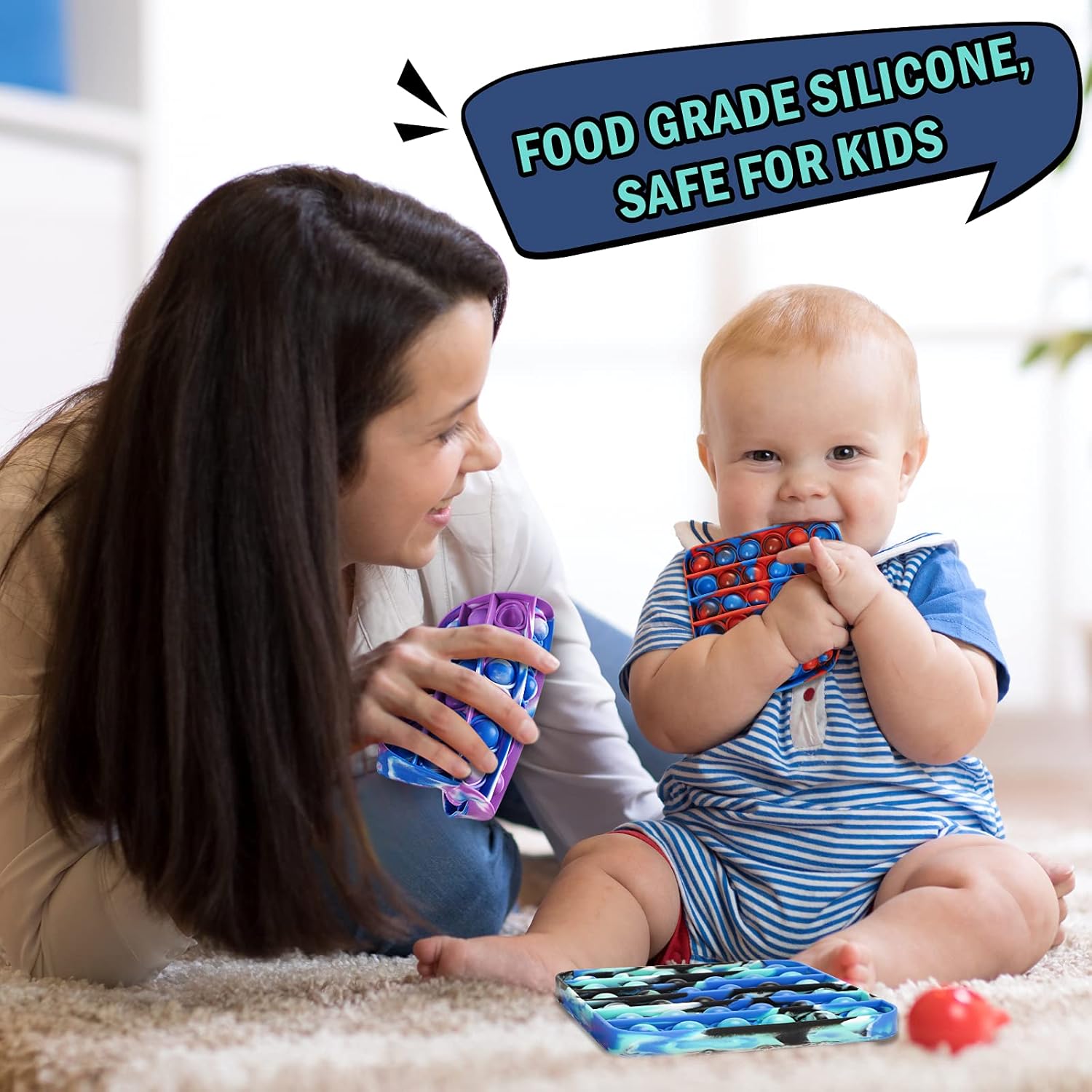 - đĽăPremium Quality and Vibrant ColorsăOur pops toys are made from food-grade non-toxic silicone, which is completely safe for kids and adults alike. Silicone is a durable material with no unpleasant smell â itâs also dishwasher safe, which makes it easy to keep clean. The color combinations are designed to be visually stimulating for children without being overwhelming, while the popping sounds provide great auditory feedback.
