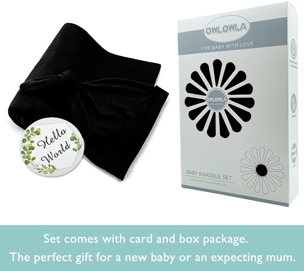 OWLOWLA Swaddle Blanket and Hat Set Newborn Swaddle Wrap Baby Receiving Blanket for Baby Boys Girls(Black)