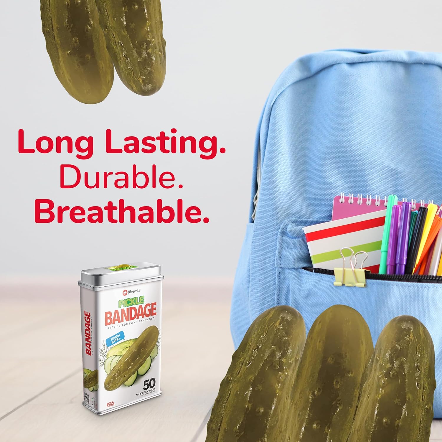 - PICKLE BANDAGES: This 50 piece tin of adorable and delicious looking pickle bandages is great for putting a smile on kids' faces while protecting wounds such as cuts, scrapes, and burns; sticky bandages are perfect for kids and adults alike, and also for school nurses and pediatric doctors