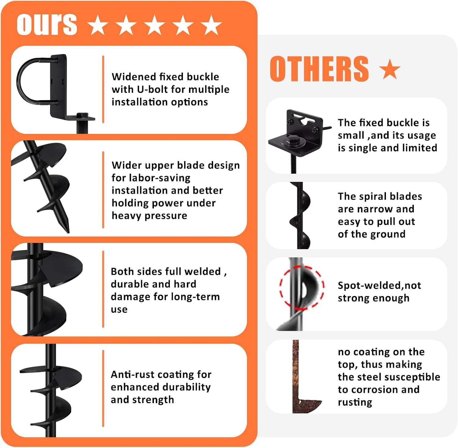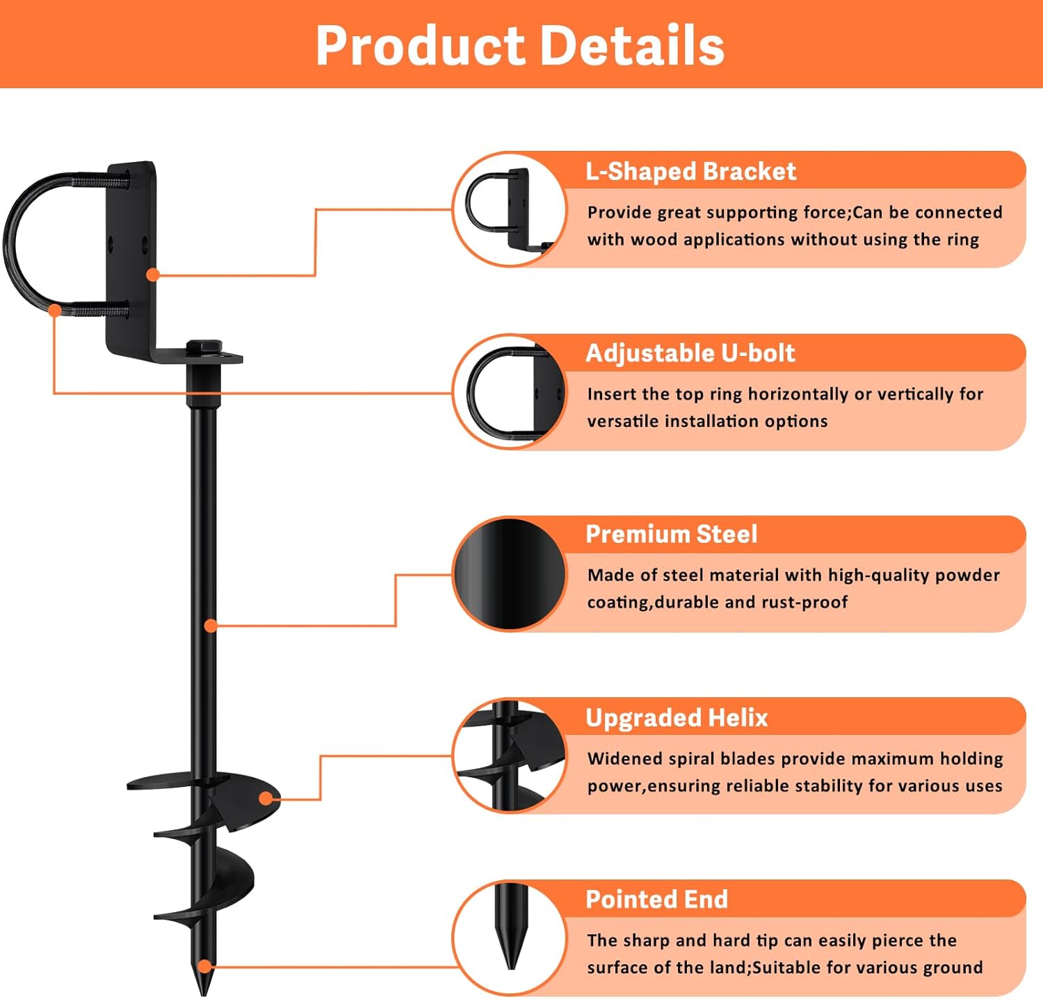 - Adjustable L-shaped head: The trampoline anchors' adjustable L-shaped head with a wide helix provides enhanced stability and prevents movement, even in challenging weather conditions.