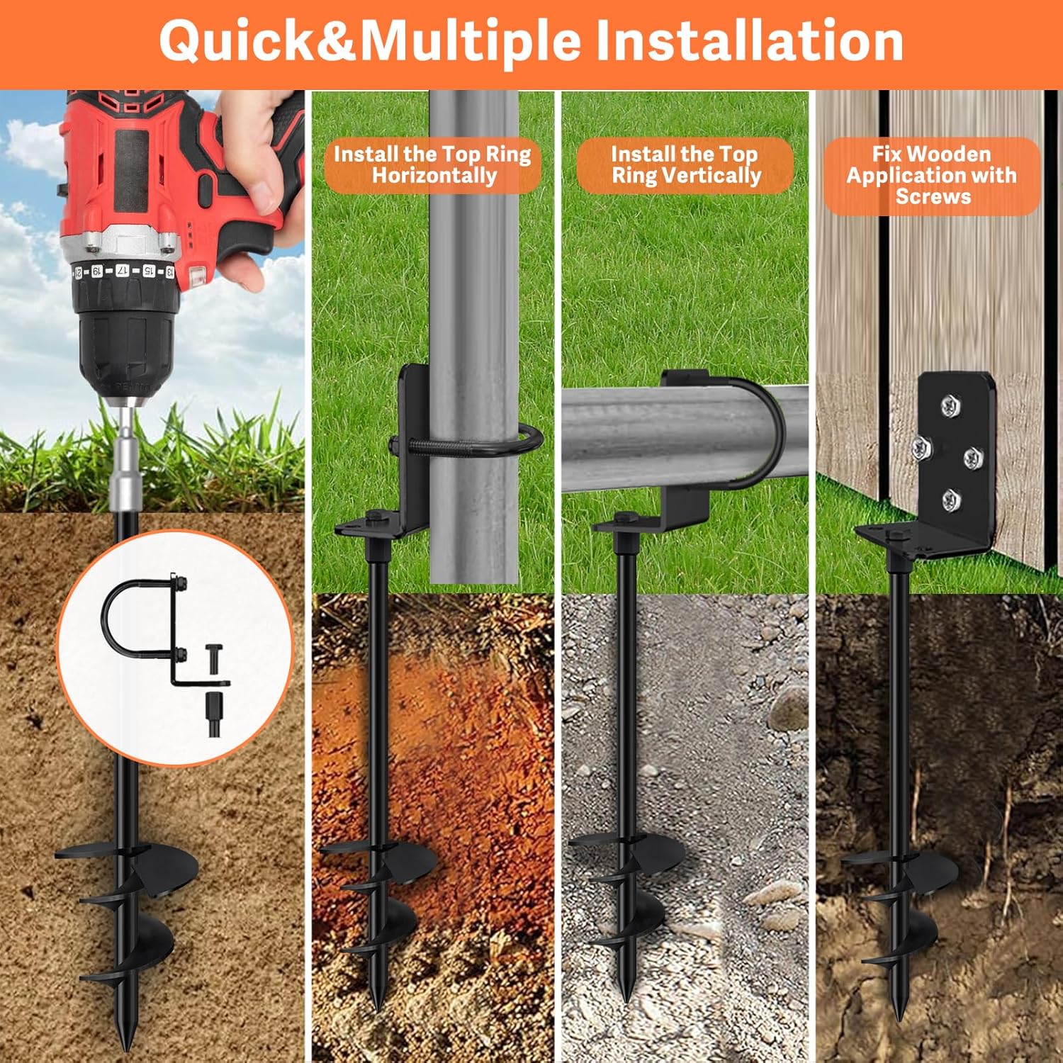 - 3 installation scenario: These anchors can be installed horizontally or vertically by adjusting the top ring, or screwed into the wooden application by unscrewing the top ring, widely apply to such as trampolines, shed, carport, greenhouse,canopy,gazebo,dog tie-outs.