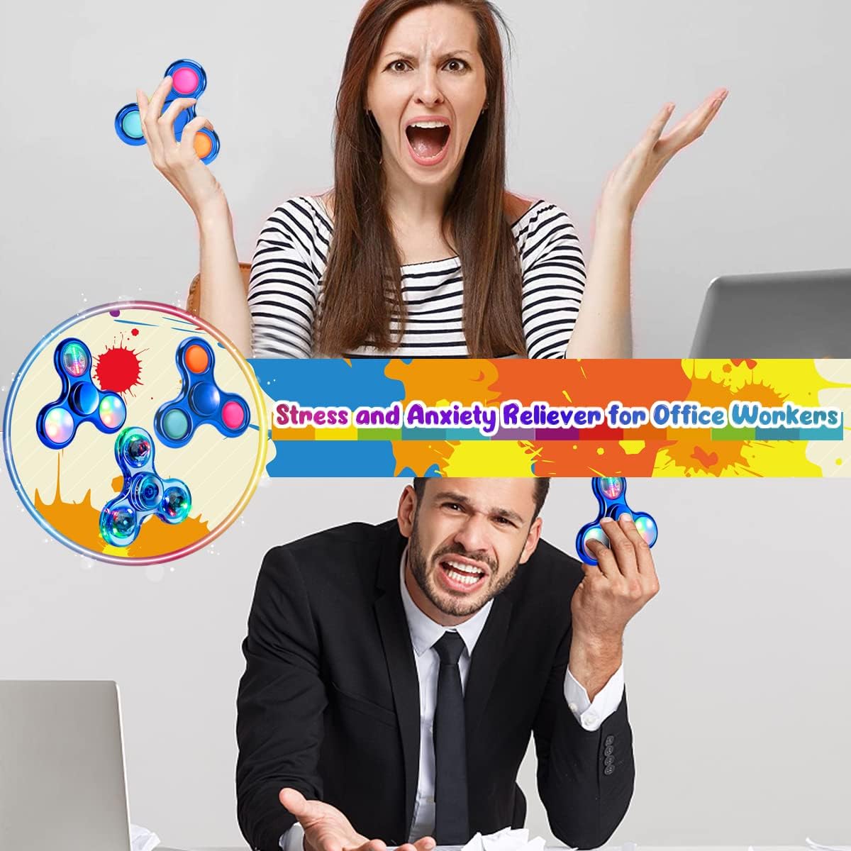 - đăANXIETY RELIEF AND STRESS REDUCTION HAND SPINNERăThey are a perfect stress reducer for kids. In addition, It is also a great fidget spinner for people with ADHD, autism, and anxiety. With the pop bubbles fidget spinner light up, you will be able to curb bad habits such as nail biting and smoking. When you are alone, your boring time will pass away quickly.