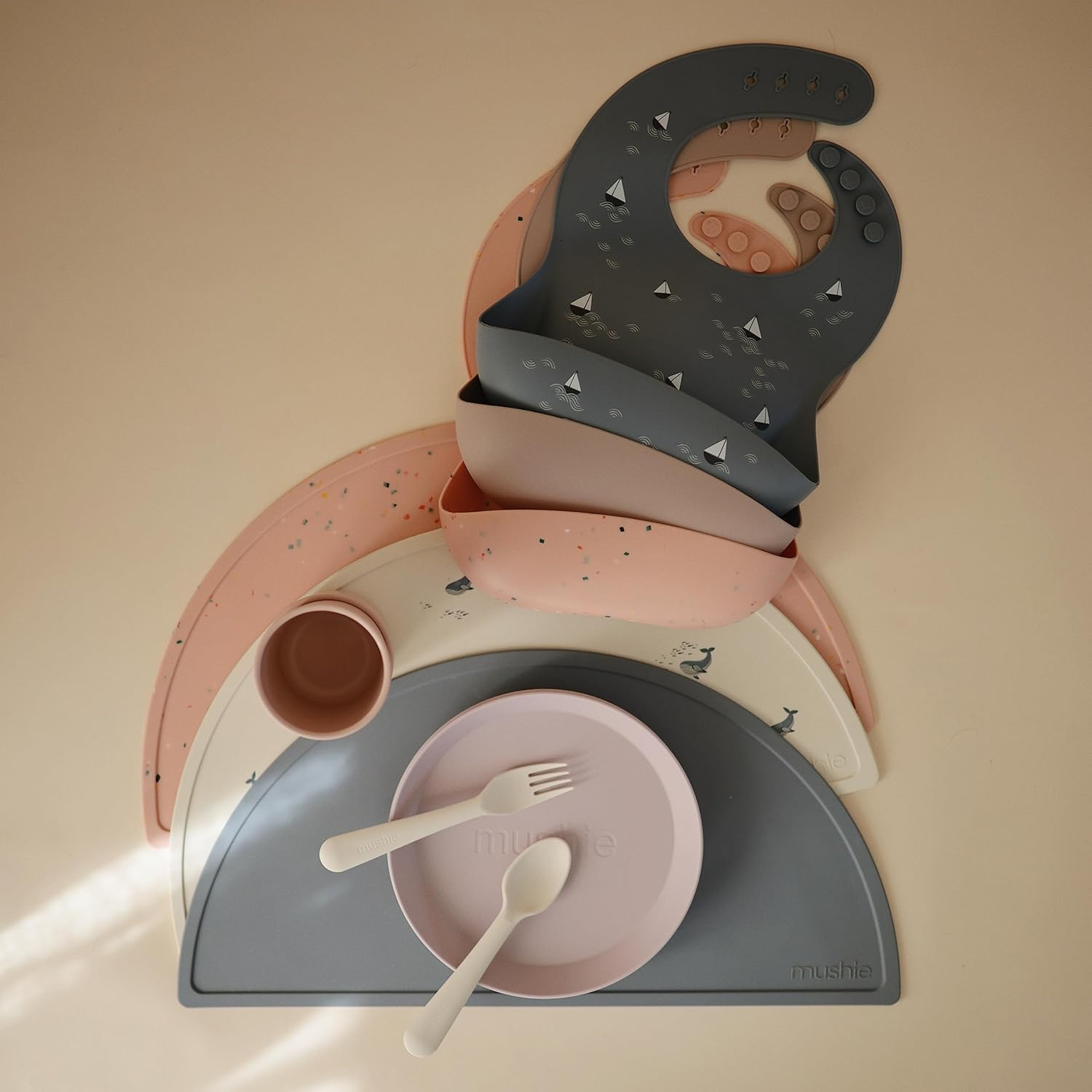 - Keep your little one feeling comfy and clean with our fun-loving collection of silicone bibs. Designed in Sweden, mushie bibs feature classic patterns capturing a look that's both timeless and elegant. Our timeless colors and patterns pair well with mushie silicone placemats, splat mats and tableware.