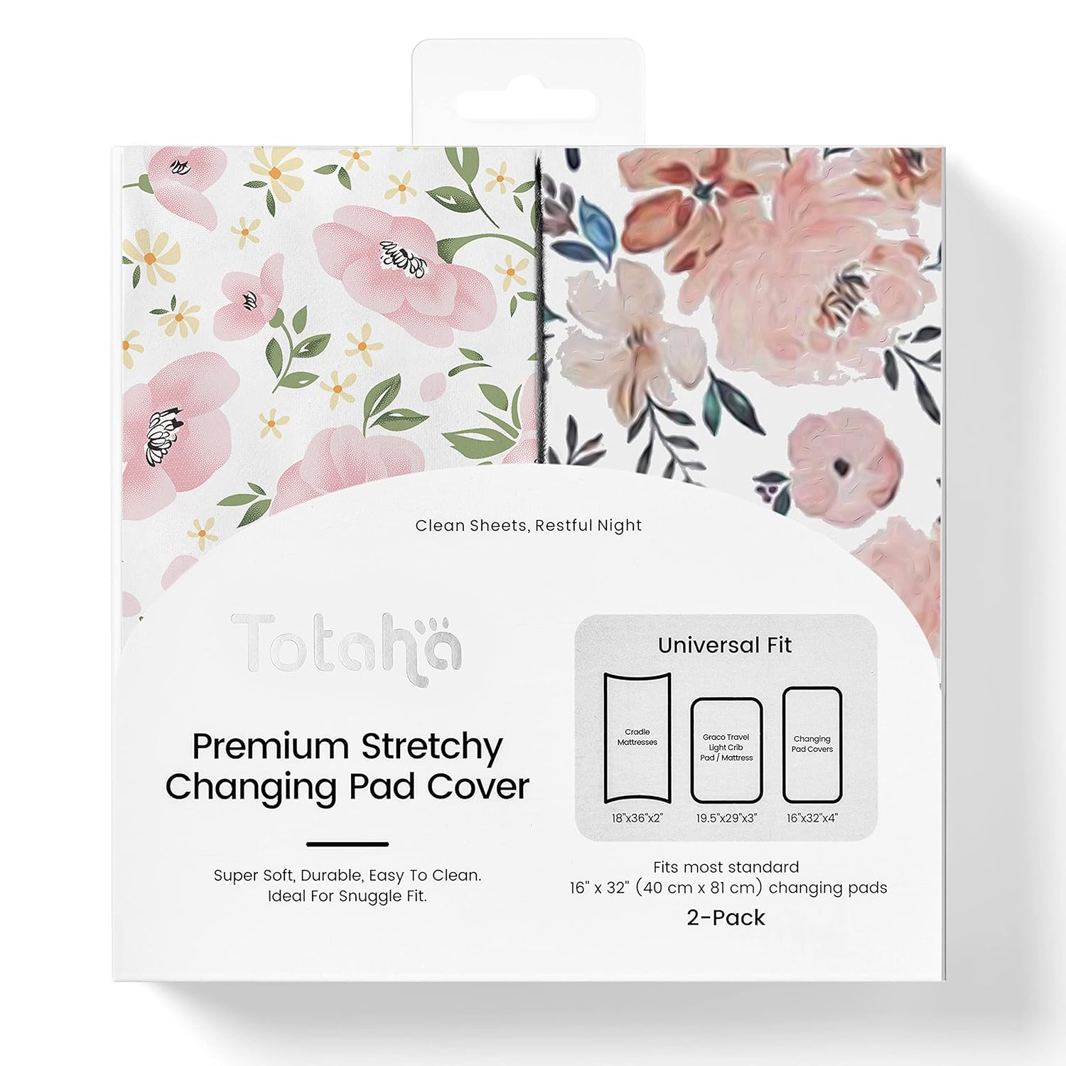 TotAha Premium Stretchy Changing Pad Covers (2-Pack) Hypoallergenic, Silky Comfort, Buttery Soft, Calming Effect, All-Season Jersey-Knit 5'' Deep Pocket(Meredith Allover Floral & Pale Pink Flowers)