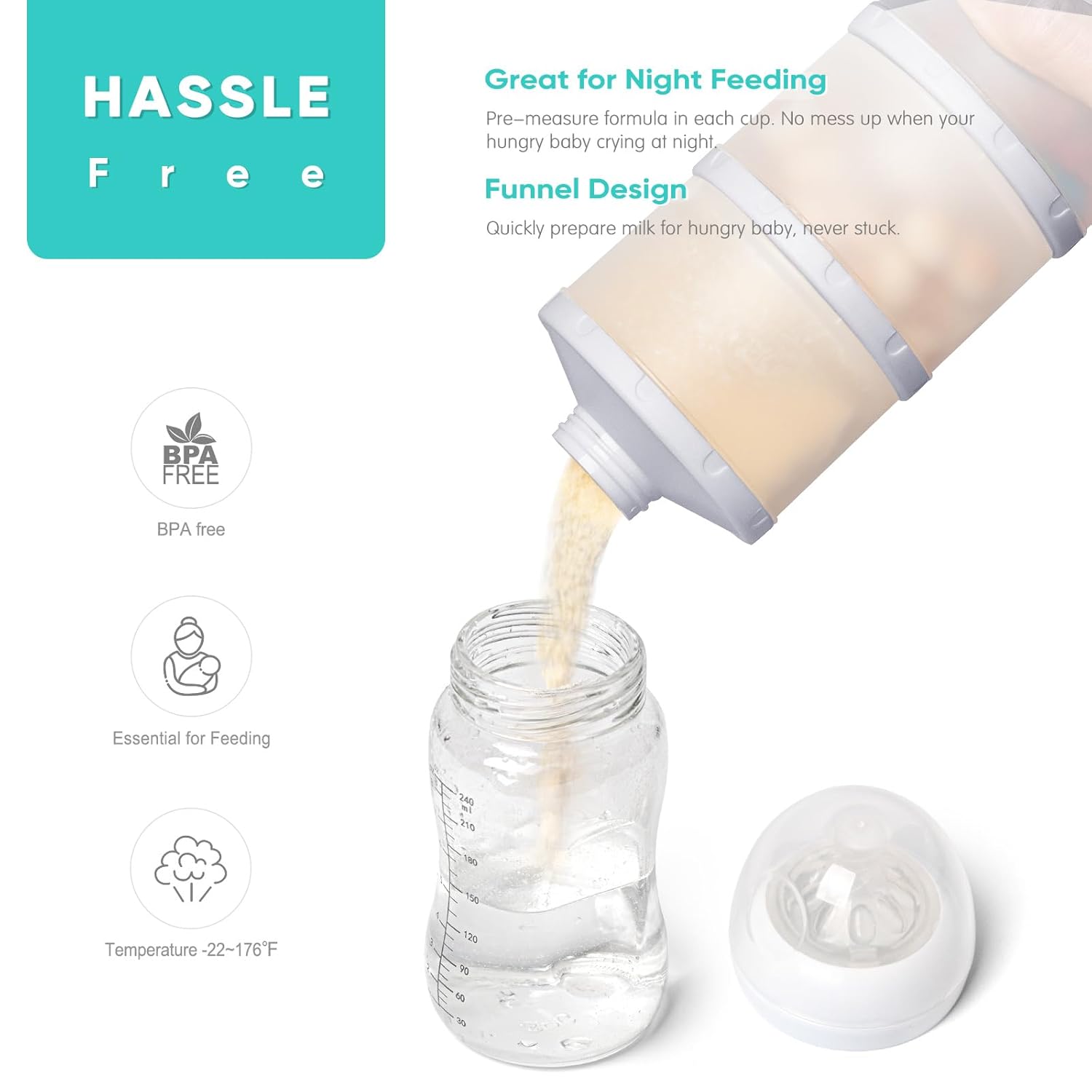 - Night Time Feeding: Pre-measure baby formula and store in the formula container, quickly make bottles at deep night or early morning. No hassle when hungry baby is crying.