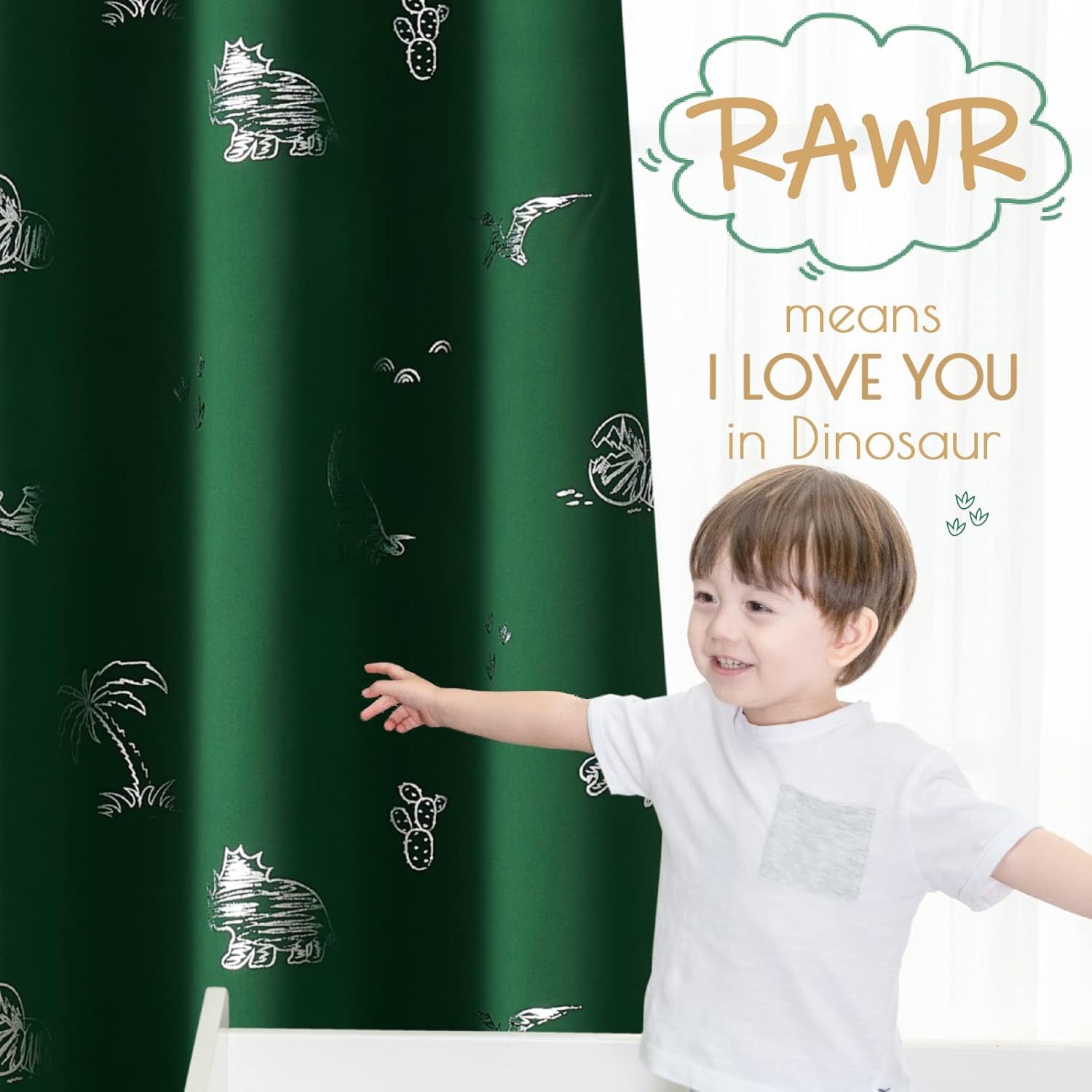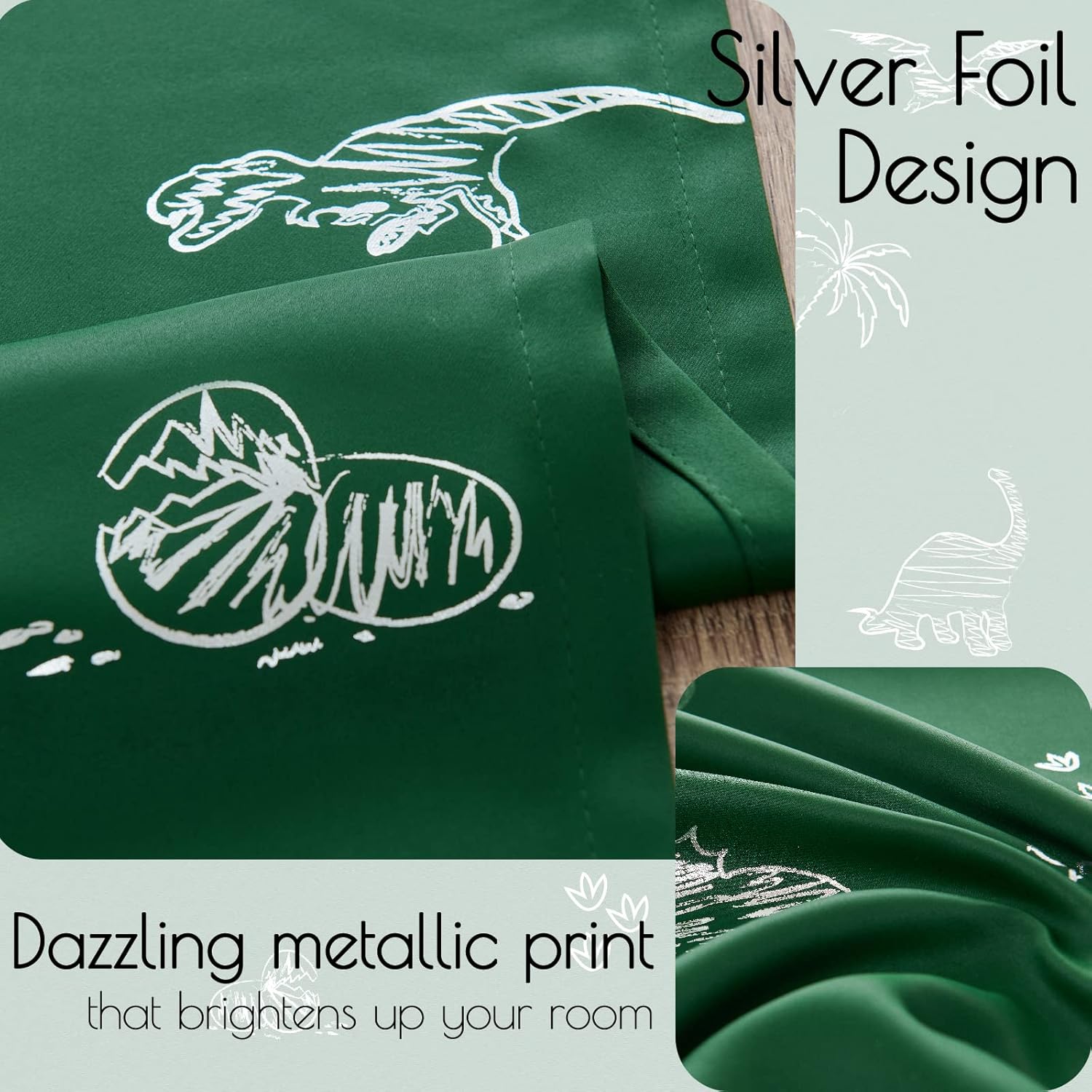 - Dinosaur Foil Printed Curtains: With these two panels 52" wide x 63" long of cute Dino Foil Printed Curtains that will add charm and whimsy to your little ones' room, guest room, or any space that needs a touch of magic