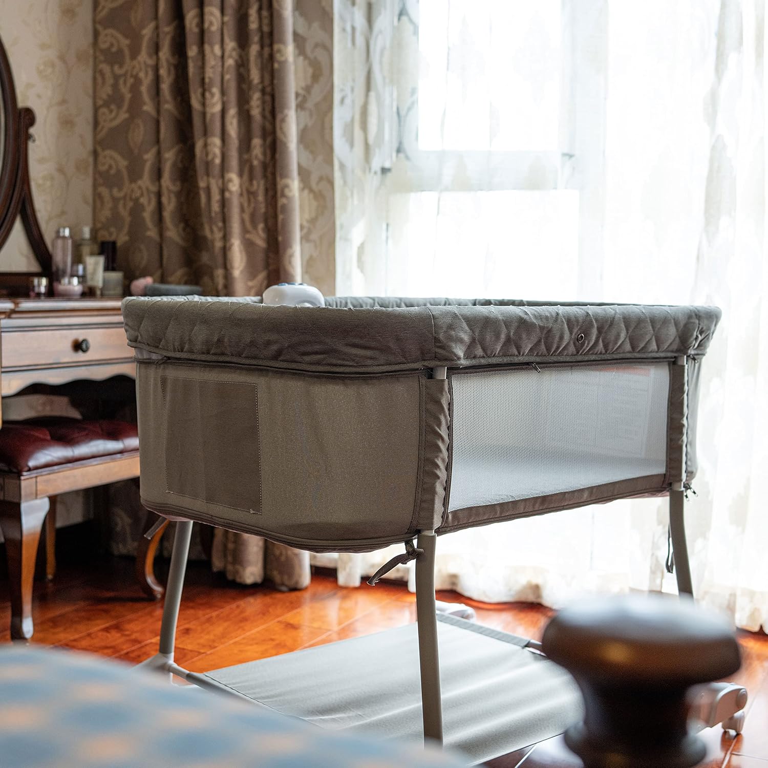 - Portable and Adjustable: 4 universal wheels with brakes are flexible. You can transfer the Bassinet to Playard easily by adjusting two zippers and four straps on the bed cover. Change the wheels’ position, you will get additional Rocker Mode