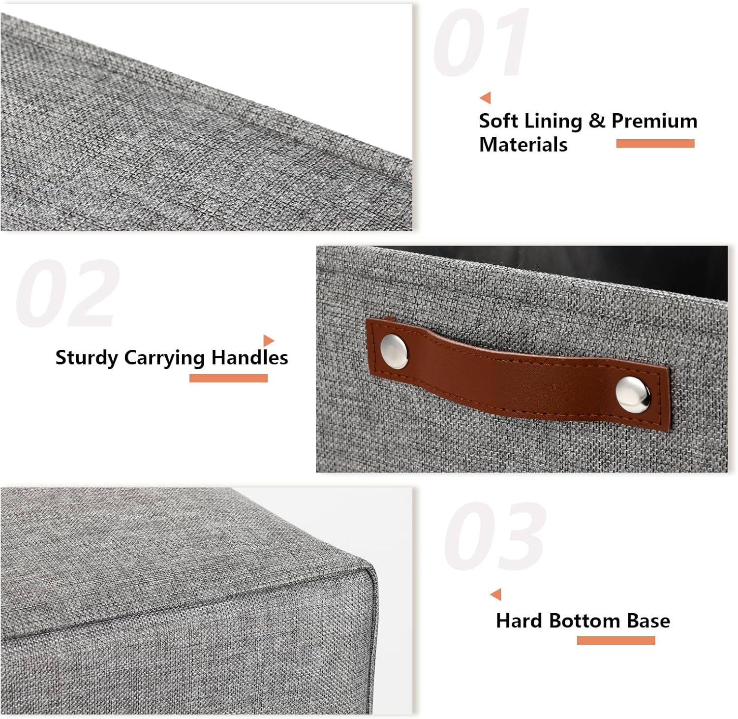 - 👏【Sturdy & Resistant】--- Set of 3 , dimensions(each): 16(L) x 12(W) x 12(H) inches. Premium Materials, resistant and has no odor. The leather handles and metal iron buckles are sturdy. The sturdy handles make fabric storage baskets easy to carry or pull off and out of shelves.