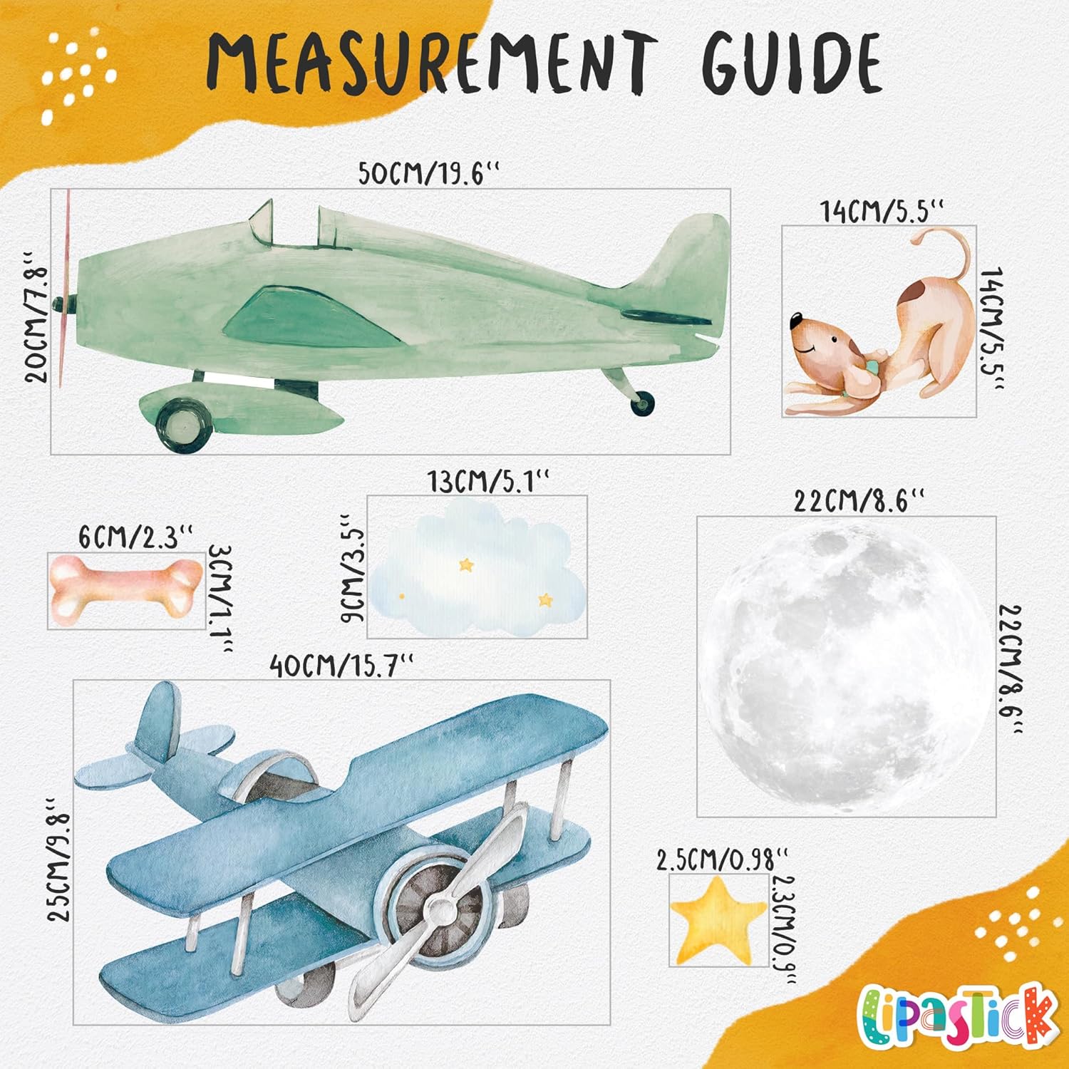 - ✈️ Kids wall decals: Airplane classroom decor comes in a pack of 4 sheets. Includes: airplane, stars, dogs and clouds. The sheet size is 15.7" x 11,8". This set of airplane decals for boys room is size M.