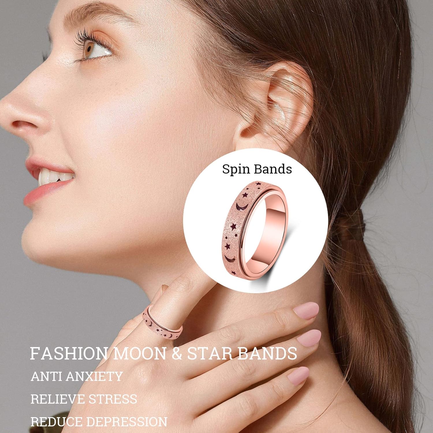 Anxiety Ring for Women Men, Titanium Stainless Steel Spinner Ring, 5 Colors, 6MM, Size 6-10, 3 Styles Anxiety Ring-Moon Star, Sandblasted Finished, Hollow Outer