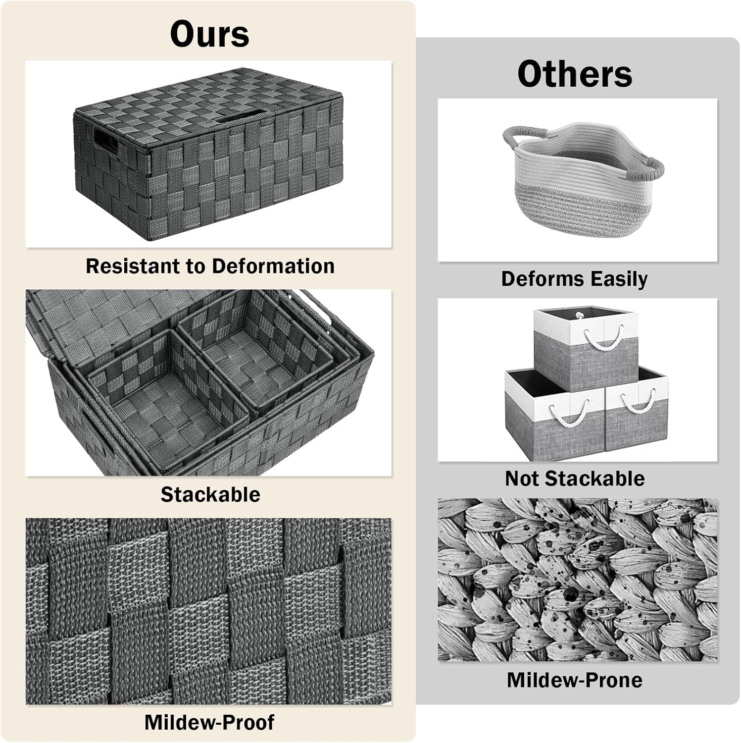 Storage Bins with Lids, Woven Storage Box Organizer Containers Decorative Baskets Cube for Clothes Bedroom Closet Office (5 Pack, Grey)