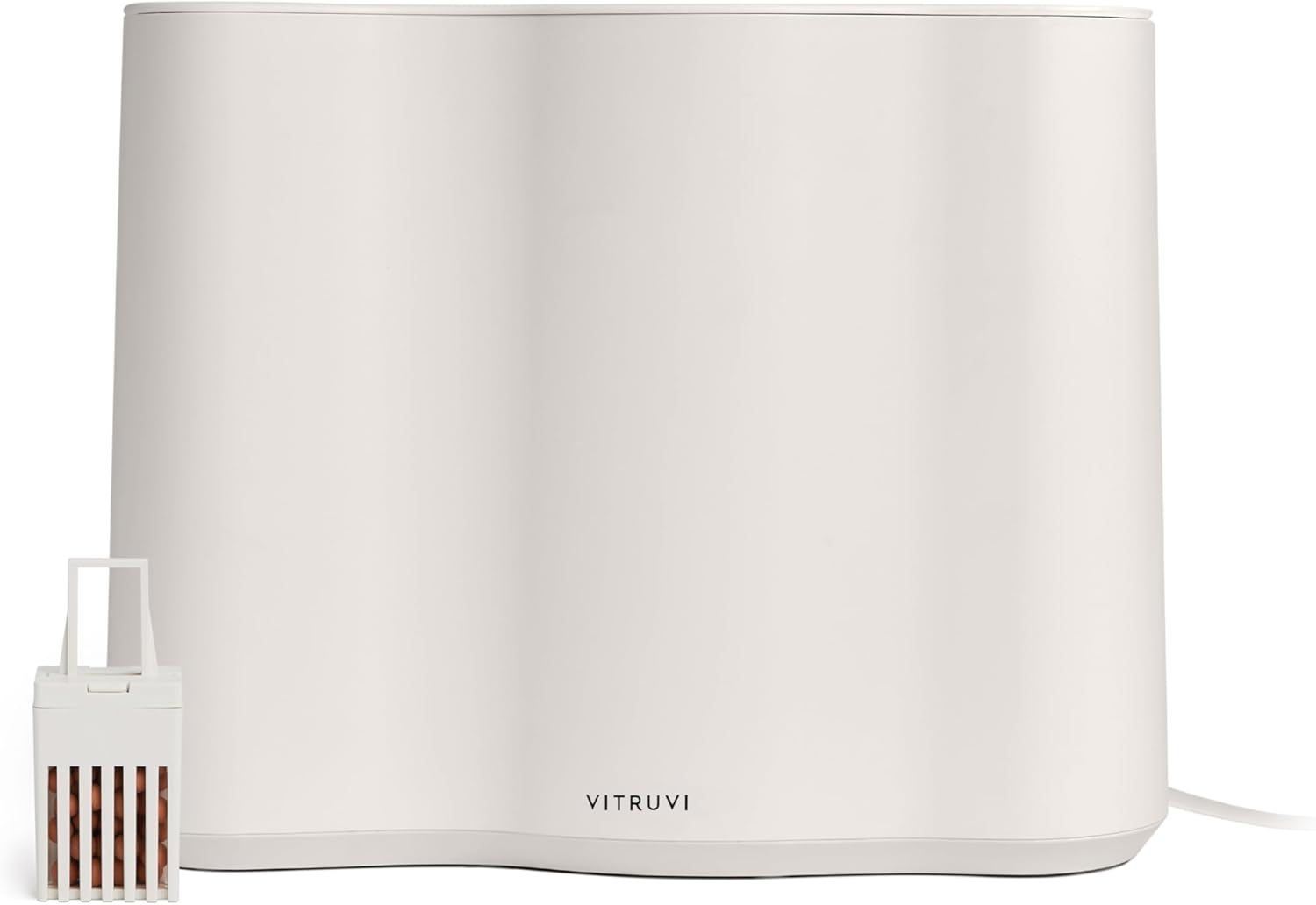 - AWARD-WINNING BEDSIDE HUMIDIFIER TO IMPROVE YOUR SLEEP: Vitruvi Cloud bedside humidifier 1.5L cool mist humidifier is designed specifically for the bedside, office, and kids rooms. Designed to emit the finest mist to efficiently and effectively humidify rooms of 602ft² for 24hrs emitting up to 260ml/h of filtered water using Vitruvi patented 360-degree adjustable spout for targeted and efficient humidification.