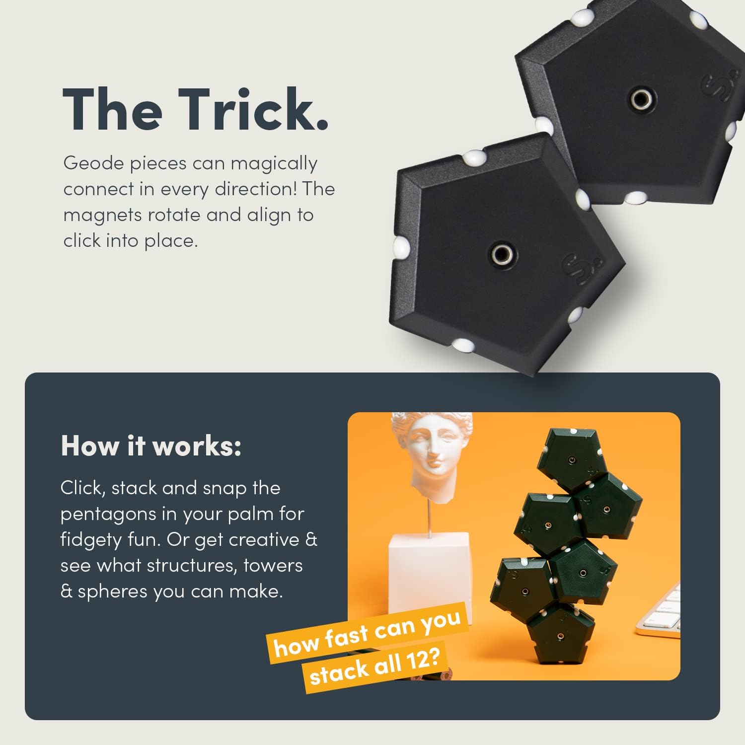 - FUN FRUSTRATION FREE FIDGET: Fidget to find your favorite configuration! Geode pieces connect on every side so you’ll always find a connection. Easy to use, harder to master - you’ll be playing with these pentagons permanently! Way more fidgeting fun than a fidget spinner, trust us!
