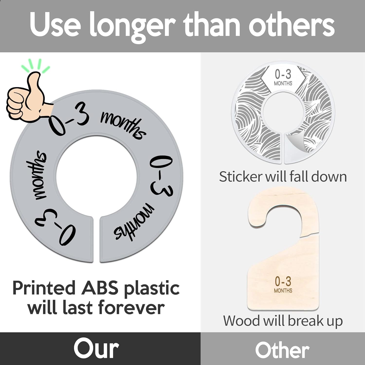 - 【Double Printed】:The Baby Closet Dividers are double printed big words all over the plate so that parents can easily see it clearly even the Baby Closet Dividers are not staying upright. In addition, printed word will not fade but the sticker will fall down
